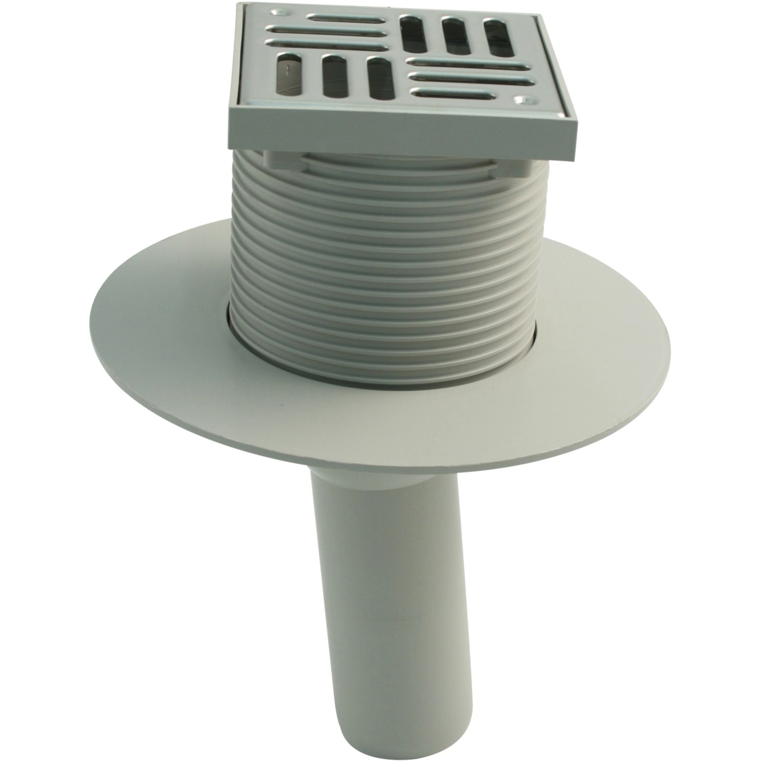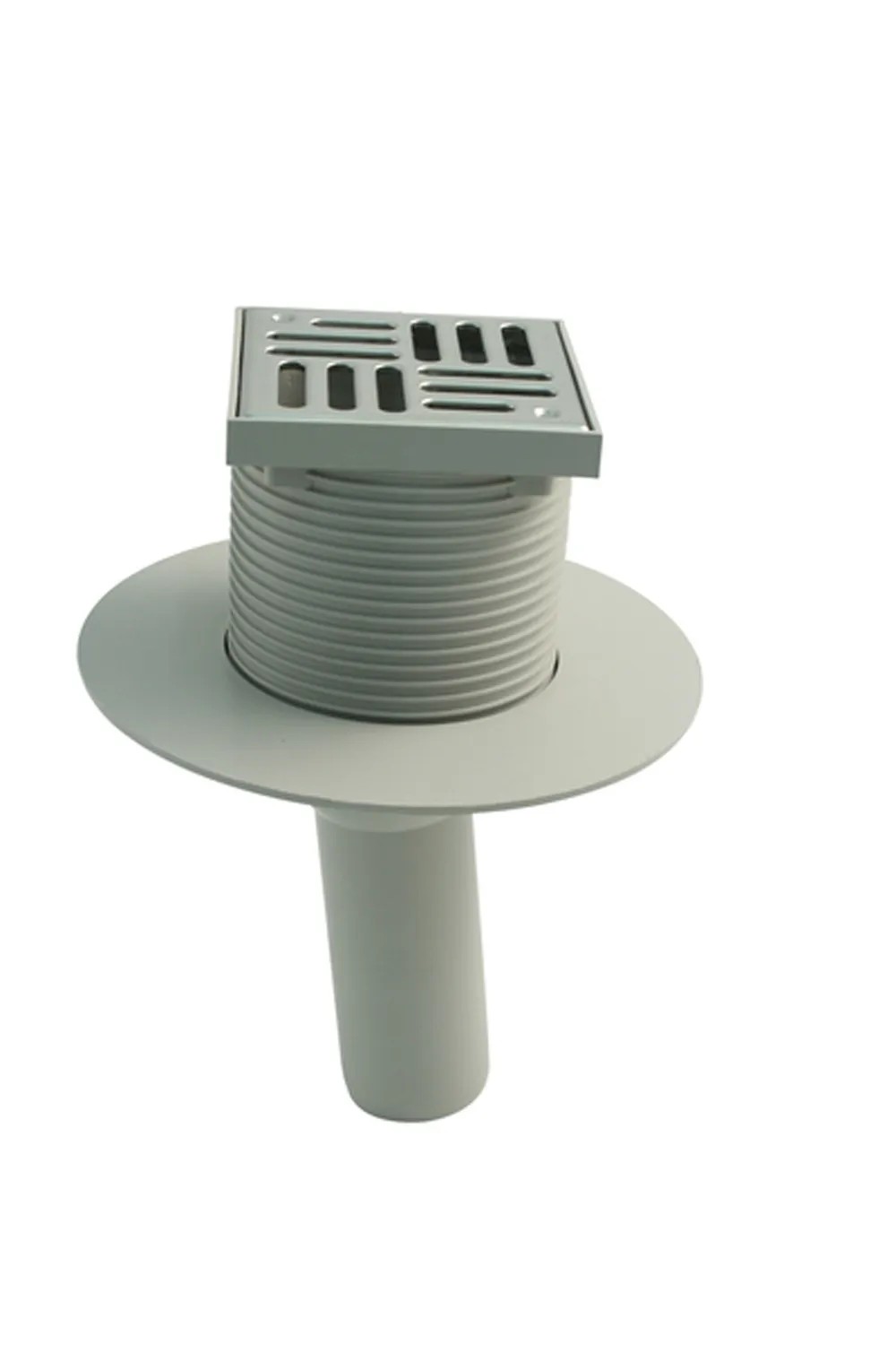 Balkonablauf aus temperaturbeständigem, schlagfestem ABS-Kunststoff (Acrylnitril-Butadien-Styrol) mit senkrechtem Abgang DN 50 zum Anschluss an HT-Rohr DN 50 (Muffe). Der Aufsatz für die Gitterroste hat eine Höhe von 100 mm und ist alle 4 mm in der Höhe kürzbar.