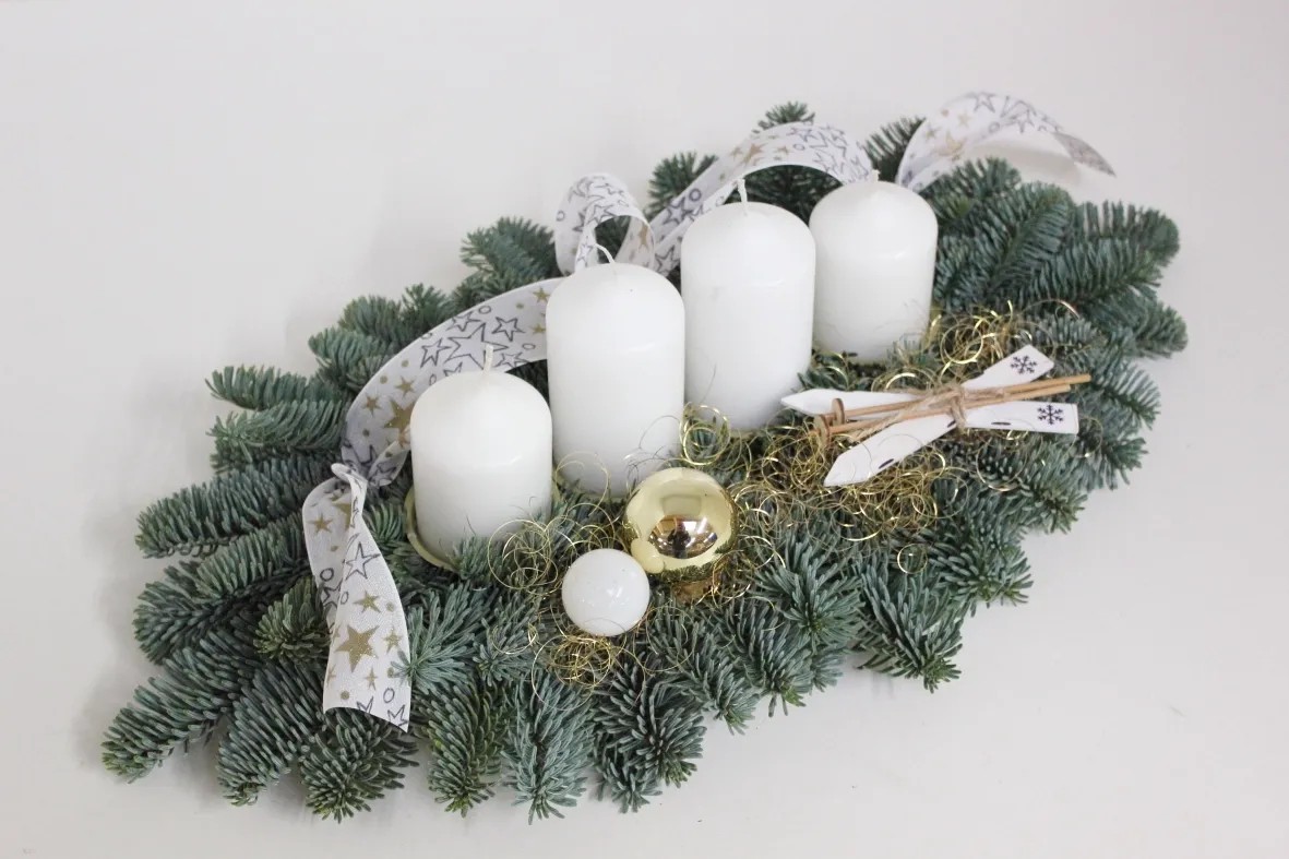 Mit diesem eleganten Adventsgesteck aus echter Nobilistanne schaffen Sie sich eine weihnachtliche Stimmung mit echtem Kerzenlicht in der Adventszeit. Die 4 hochwertigen Kerzen wurden in Deutschland gefertigt und garantieren ein sauberes und sicheres Abbrennen. Verziert ist das Arrangement mit modernen weihnachtlichen Schleifenband und Dekorationen.