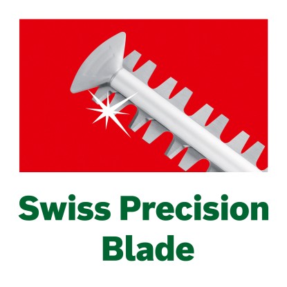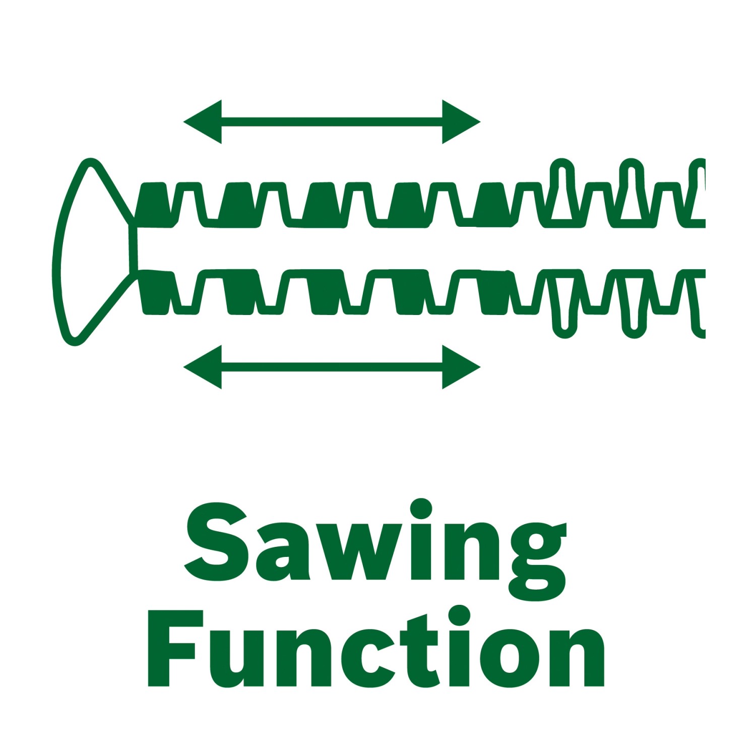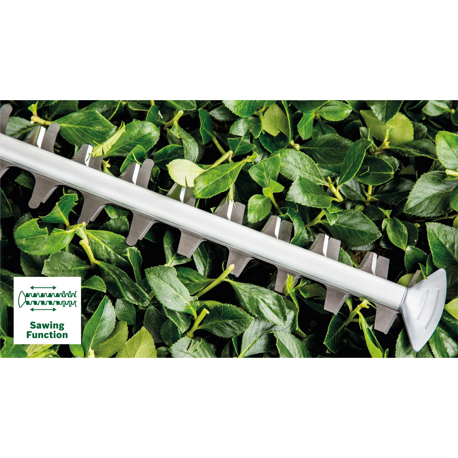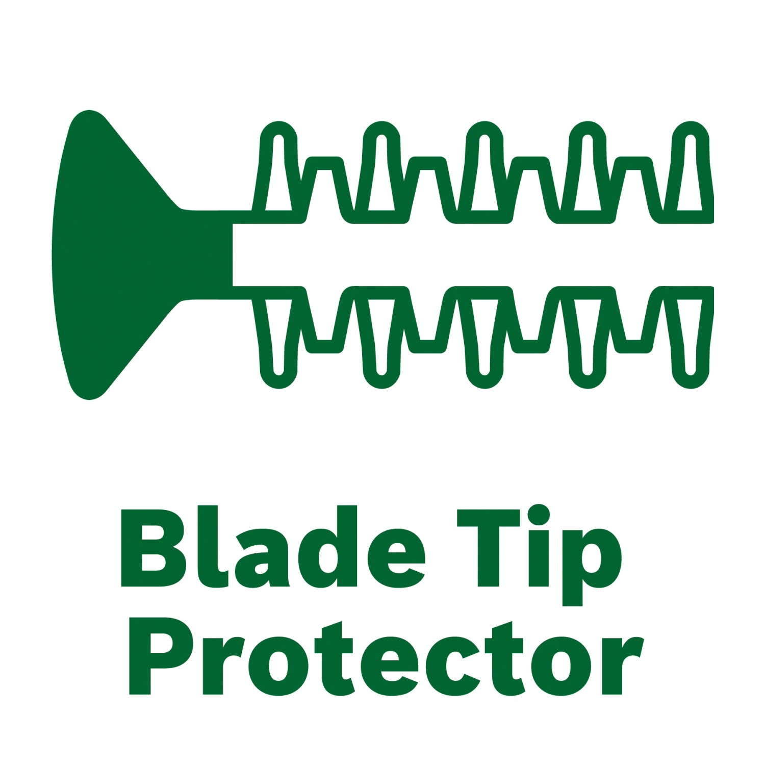 Die Heckenschere verfügt über Sägezähne am Messerende zum Schneiden von bis zu 25 mm dicken Ästen und einen Messerschutz zum sicheren Schneiden entlang von Mauern und Wegen.