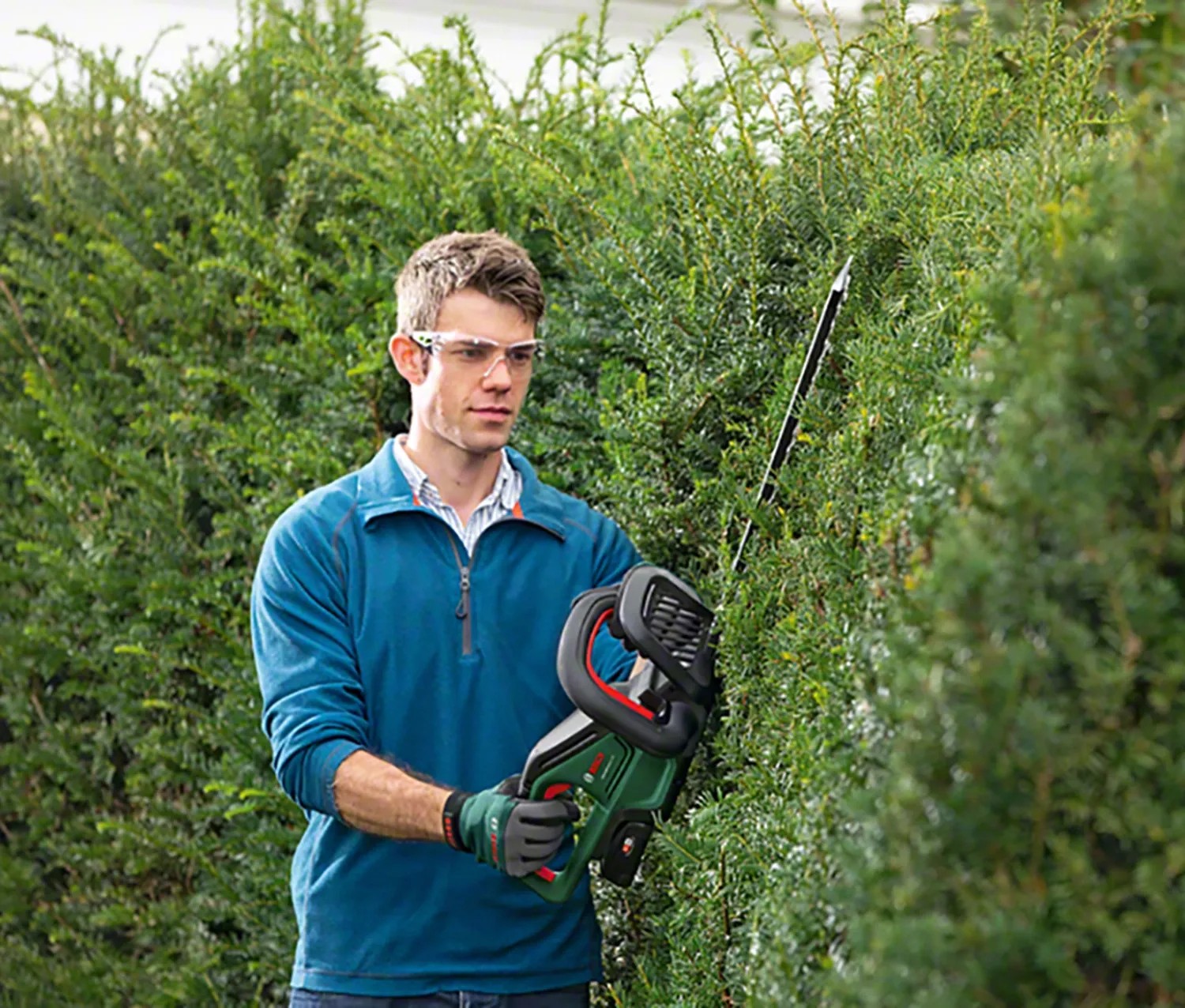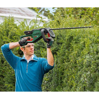 Der vordere Griff mit mehreren Positionen ermöglicht bequemes und ermüdungsfreies Arbeiten in jeder Position. Eine 55-cm-Klinge mit 20-mm-Zahnöffnung und das Bosch-Antiblockiersystem ermöglichen ein kraftvolles und kontinuierliches Schneiden ohne die Gefahr von Blockierungen. Sie verfügt über eine Blattsäge für Äste mit einer Breite von bis zu 25 mm und einen Blattspitzenschutz für das sichere Schneiden entlang von Wänden und Wegen.