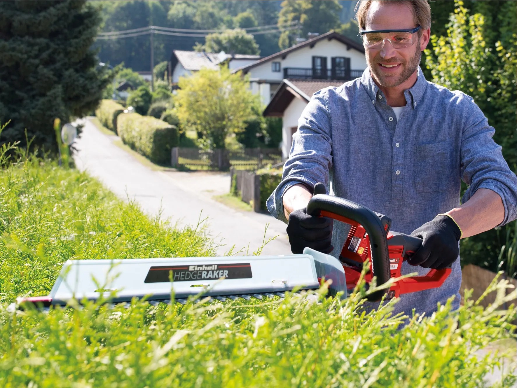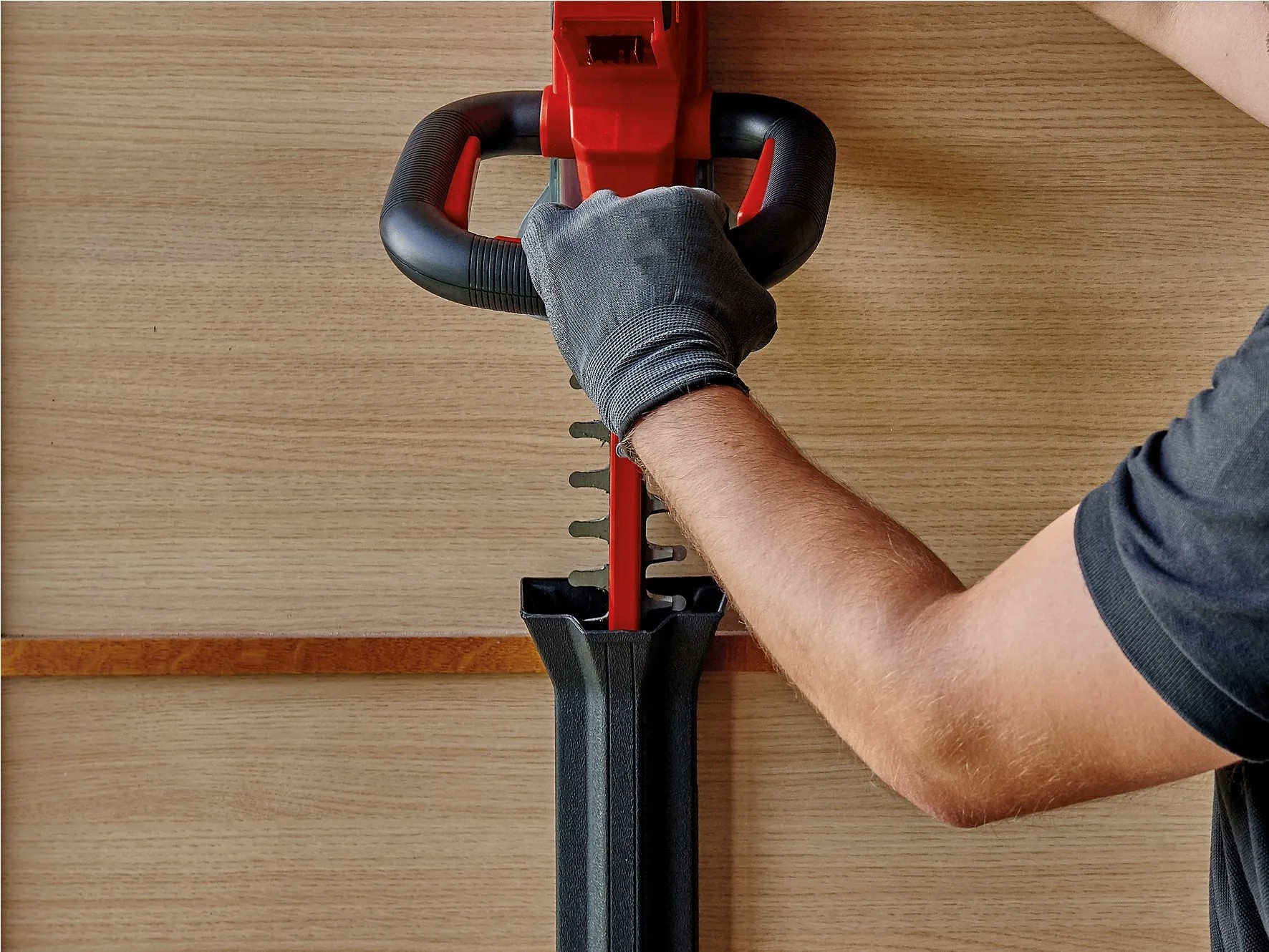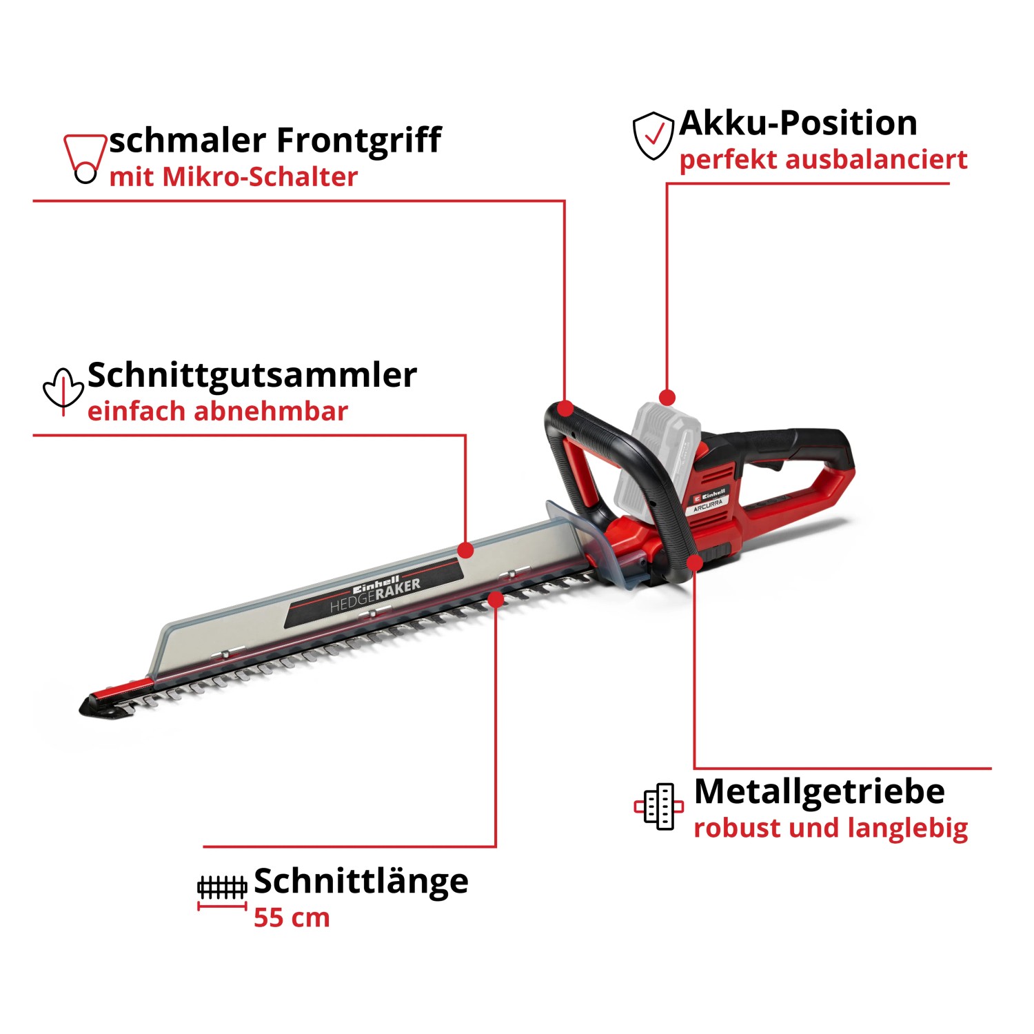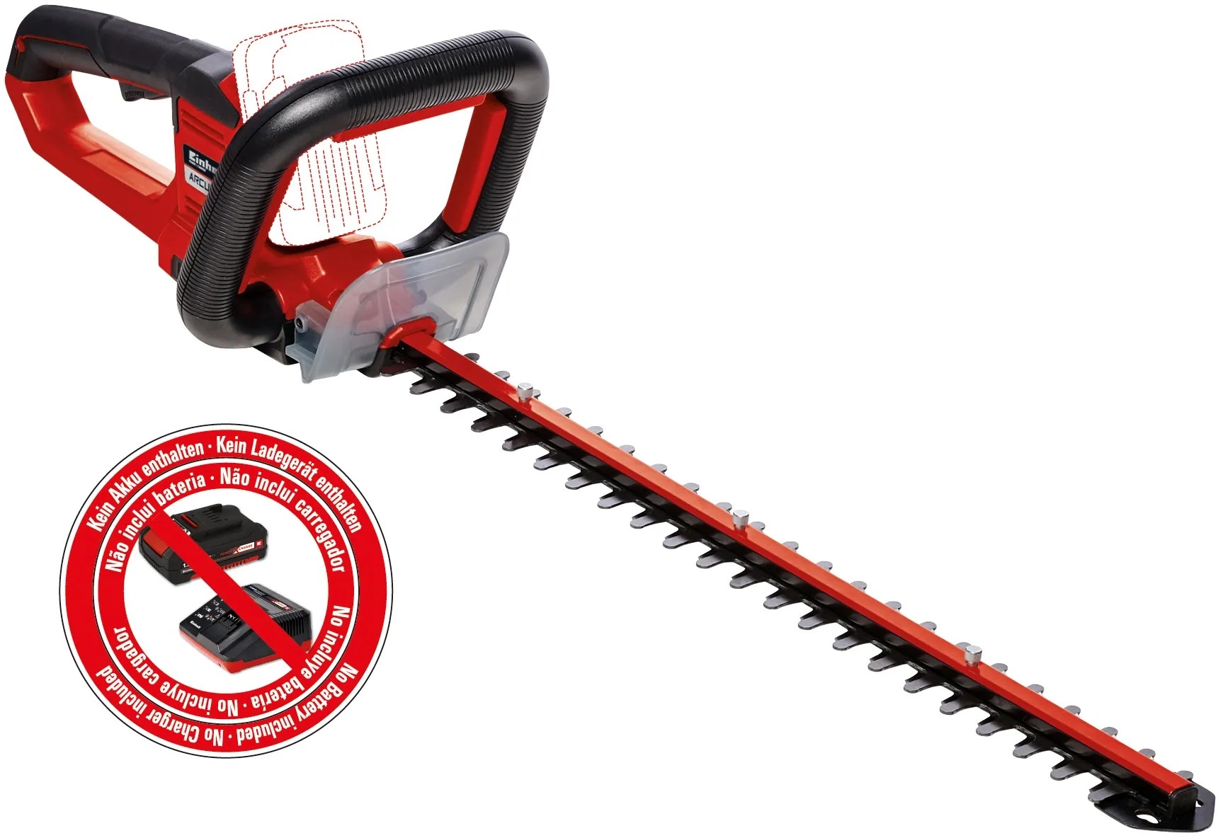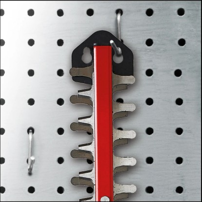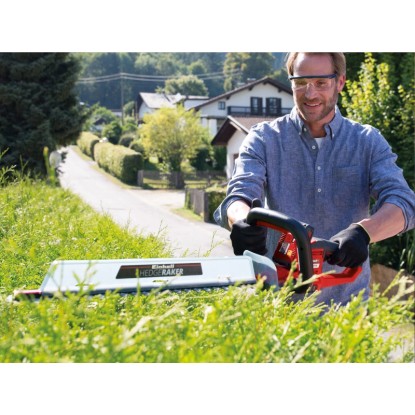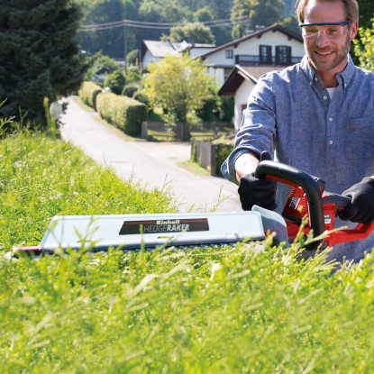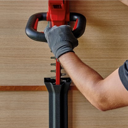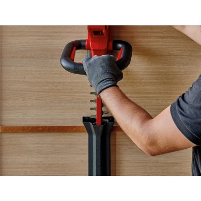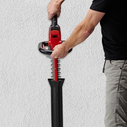 Durch den praktischen Schnittgutsammler lässt sich beim Schneiden der Hecke das Schneidgut perfekt von der Heckenoberseite abtragen. Die Alu-Messerabdeckung sichert die Messer und der stabile Köcher schützt bei der Lagerung und ist zudem für einen sicheren Transport geeignet. In der Lieferung inklusive ist ein Stossschutz mit einer Halterung für die Wandmontage. Für den Betrieb der Einhell Akku-Heckenschere Arcurra ist ein 18 Volt Power-X-Change-Akku notwendig.