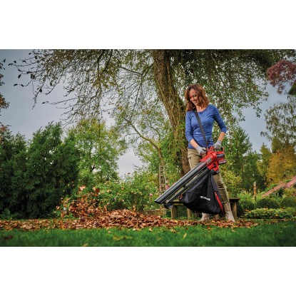Der Venturro von Einhell ist Laubgebläse und Laubsauger zugleich. Mit einem Umschalter wechseln Sie einfach zwischen den Funktionen. Als Laubbläser erreicht er eine Geschwindigkeit von 210 km/h und bläst das Laub kraftvoll zusammen. Als Laubsauger bringt er es auf eine Saugleistung von 210 m³/h. Das Sauggut wird auf ein Zehntel gehäckselt und landet dann im 45 l grossen Fangsack. Dieser lässt sich per Click-In schnell am Laubsauger befestigen und hat ein Sichtfenster, damit Sie immer sehen, wann er ausgeleert werden muss. Mit der Drehzahlregulierung können Sie die Saug- und Blasleistung individuell an den Schmutz und Untergrund anpassen