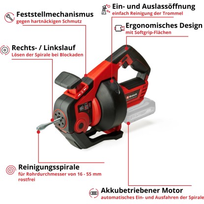 Soll die Trommel des Rohrreinigers gereinigt werden, ist dies durch die Ein- und Auslass-Öffnung bequem möglich. Dank des Feststellmechanismus kann auch hartnäckiger Schmutz entfernt werden. Der Akku-Rohrreiniger ist geeignet für Rohre mit 16 - 55 mm Durchmesser dank 7 mm starker Spirale. Eine LED sorgt dabei für das Ausleuchten des Arbeitsbereiches. Das ergonomische Design mit Softgrip ermöglicht zusätzlich höchste Handlichkeit.