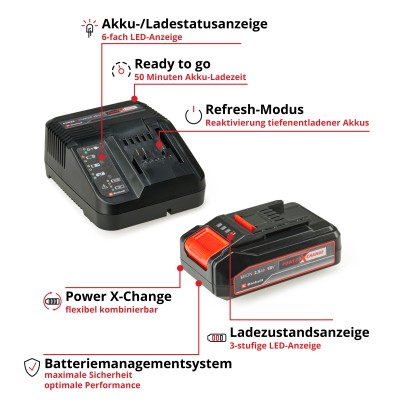 Das Einhell Akku-Starter-Kit PXC mit 18 V und 2,5 Ah ist die ideale Basis, um das heimische Power-X-Change-Sortiment aufzubauen. Mit einem Akku und einem Ladegerät für alle Geräte spart man bei der Anschaffung erhebliche Kosten, die universelle Einsatzmöglichkeit schont zudem die Umwelt und bietet gleichzeitig Flexibilität. Das prozessgesteuerte, aktive Batteriemanagement-System ABS sorgt für höchste Sicherheit, optimale Geräteperformance, maximale Laufzeit und maximale Lebensdauer. Der hochwertige Akku widersteht dem Memory-Effekt und der Selbstentladung. Das Schnellladegerät ermöglicht kurze Ladezeiten, einen optimalen Ladevorgang und höchste Sicherheit dank intelligentem Lademanagement. Durch den Refresh-Modus ist die Reaktivierung tiefentladener Akkus möglich.