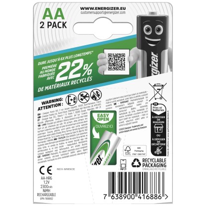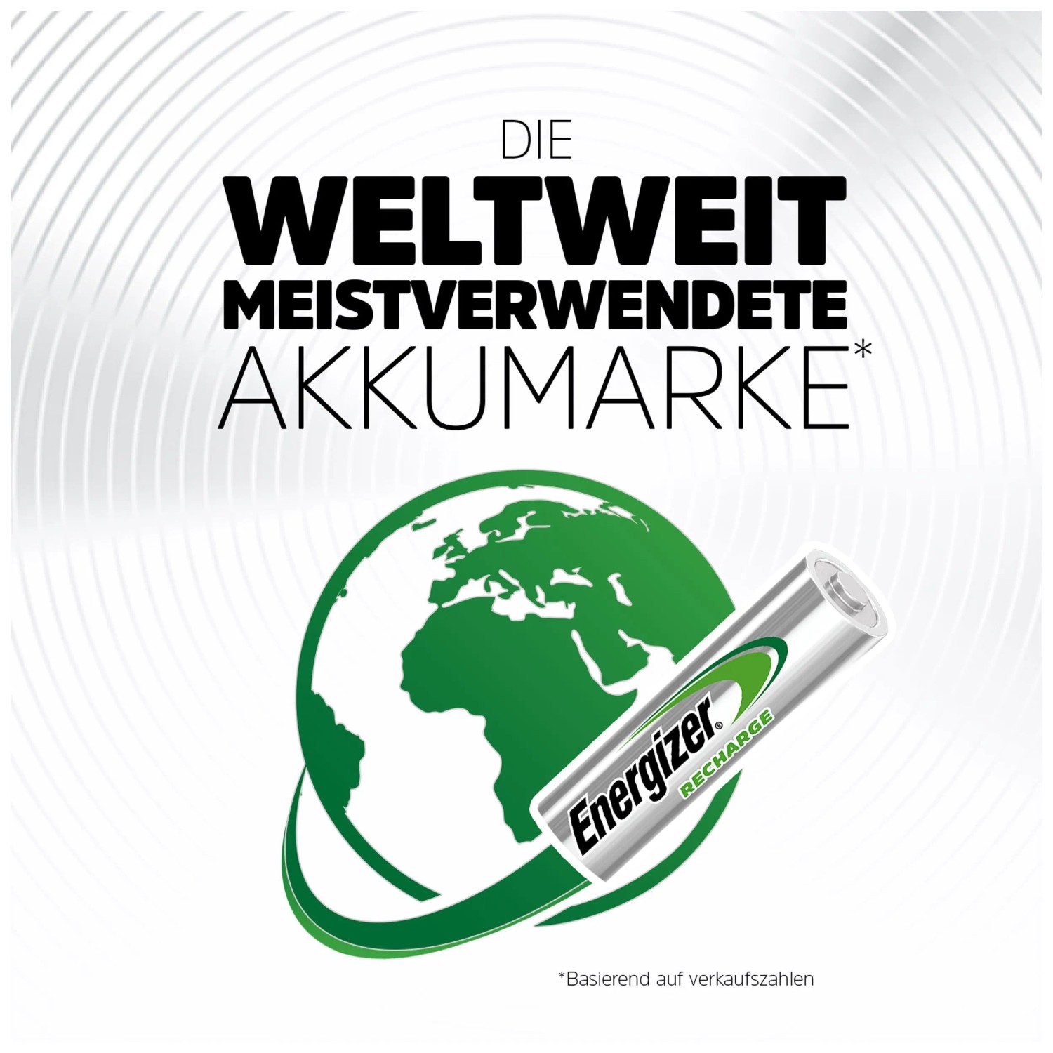 Die Energizer Akku-Batterien Recharge Extreme sind wiederaufladbare Hochleistungsbatterien für alle Geräte mit hohem Energiebedarf. Diese sind weltweit die ersten Akkus, die aus 4% recycelten Batterien hergestellt werden. Energizer Extreme Akkus bieten langanhaltende Leistung, exzellente Ladungserhaltung und ermöglichen eine hohe Anzahl an Ladezyklen. Gleichzeitig sparen sie Geld und verursachen weniger Abfall, da die Batterien seltener auszuwechseln sind. 2 Stück AA-Akkus ersetzen bis zu 1'600 Alkali-Batterien und haben eine langlebige Leistungsfähigkeit. Sie können bis zu 350 Digitalfotos pro Ladung mit den AA-Batterien aufnehmen. Die Energizer Akkus sind vorgeladen und direkt einsatzbereit und können viele 100 Mal wiederaufgeladen werden.