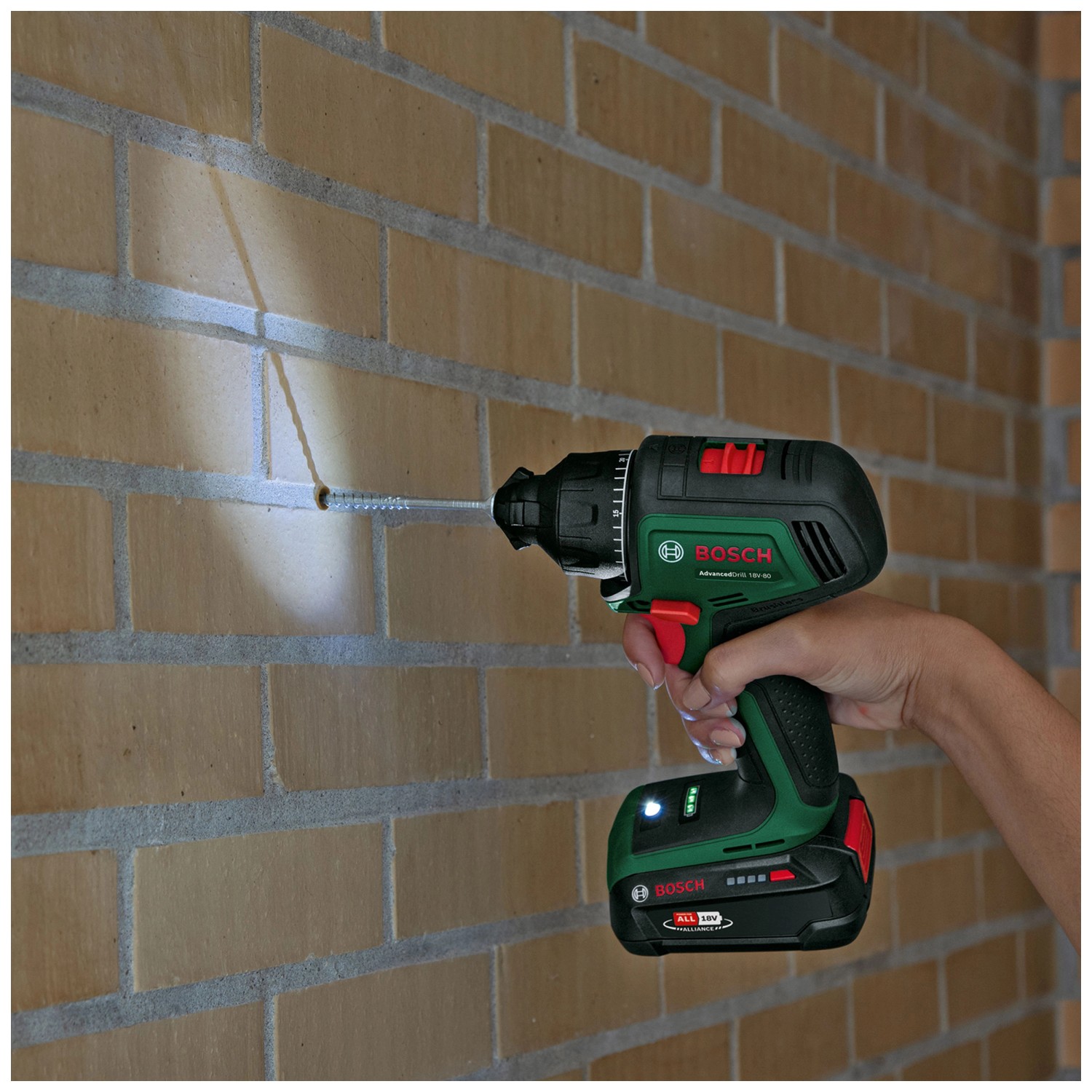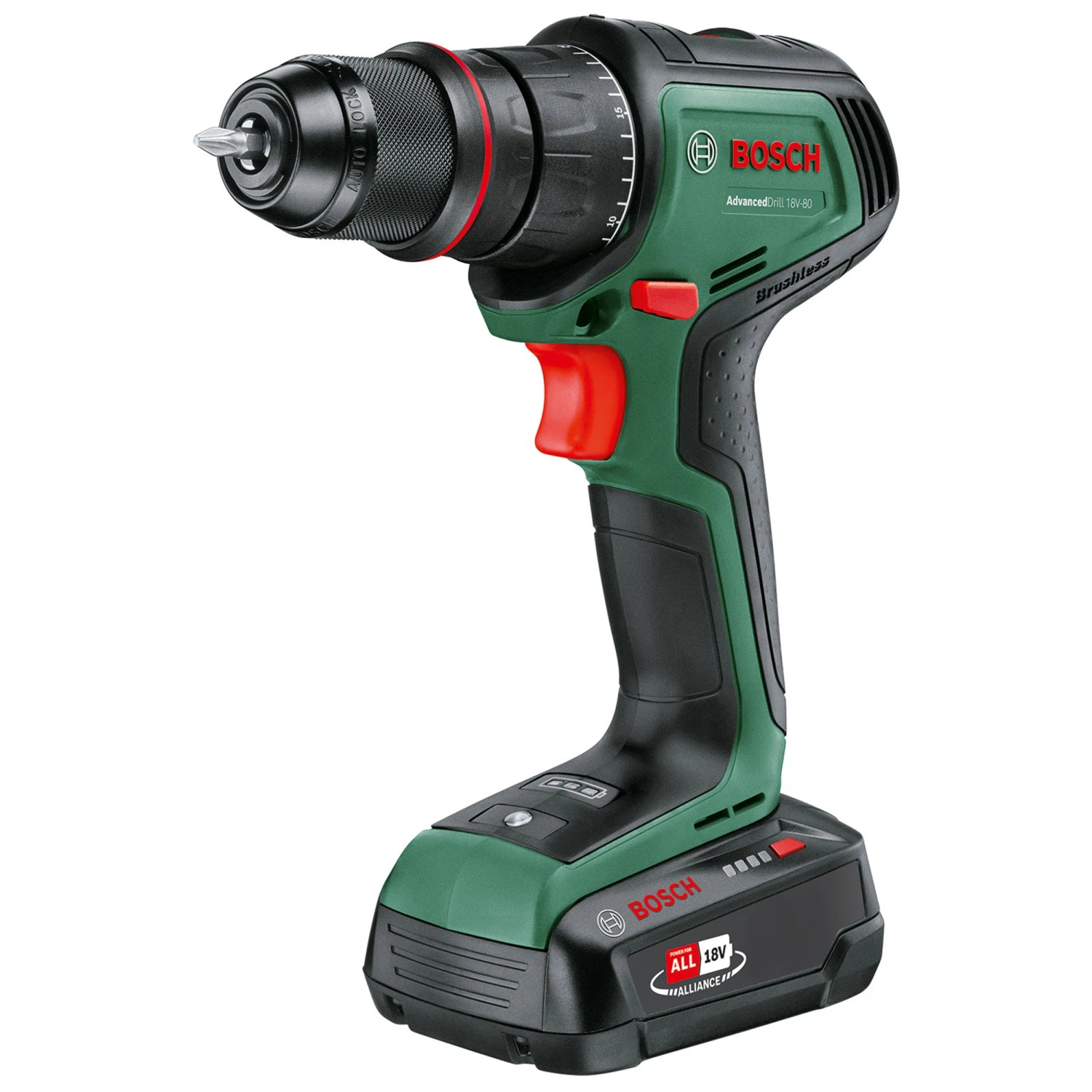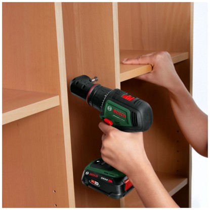 Der Bosch AdvancedDrill 18V-80 vereint kraftvolles Bohren und Schrauben mit optimaler Flexibilität. Mit seinem mächtigen maximalen Drehmoment von 78 Nm und seiner stufenlosen Drehzahleinstellung erledigt er mühelos jede Aufgabe - vom Vorbohren bis zum Einschrauben von Schrauben, Bolzen oder Befestigungselementen in Holz, Metall oder Kunststoff. Dieses robuste Werkzeug ist dank bürstenlosem Motor und abnehmbarem Metallbohrfutter sehr langlebig. Das 13-mm-Bohrfutter nimmt verschiedenste Bohrer, Schrauberbits, Lochsägen und Zubehöre auf. Die Haltefunktion der magnetischen Kappe ist sehr praktisch bei jeder Schraubanwendung, da die Schrauben nicht von Hand festgehalten werden müssen. Dieser leistungsstarke Bohrschrauber verfügt über eine QuickSnap-Schnittstelle, so dass das Bohrfutter gewechselt kann und zusätzlich erhältliche Aufsätze zum Erreichen enger Stellen verwendet werden können. Ein Zusatzhandgriff verbessert die Kontrolle und Stabilität beim Arbeiten, was zu mehr Komfort und weniger Ermüdung führt. Die integrierte Bosch Syneon Technology sorgt für optimale Leistung und maximale Laufzeit. Das Gerät ist Teil des 18-V-Power-for-all-Systems. Ein einziger Akku kann für alle 18-V-Power-for-all-Werkzeuge verwendet werden.
