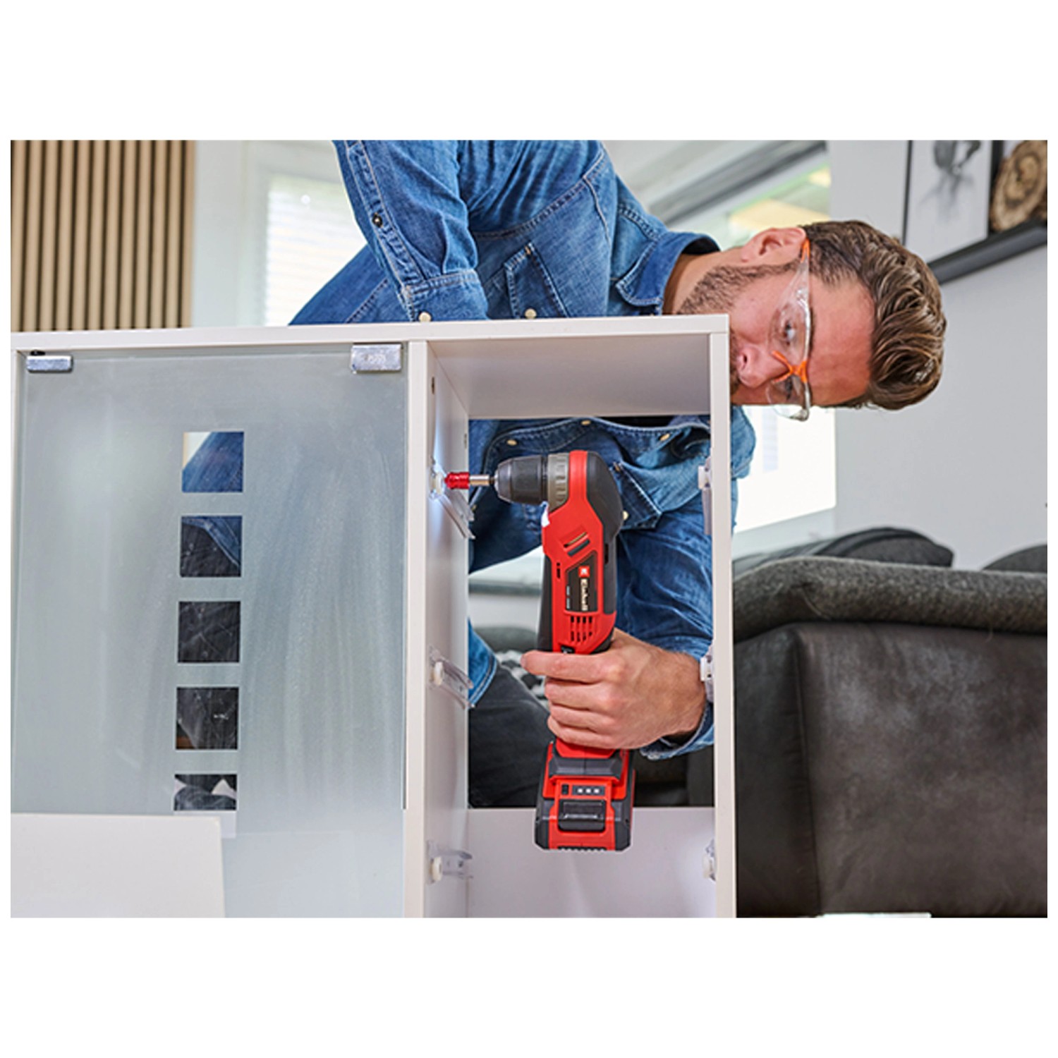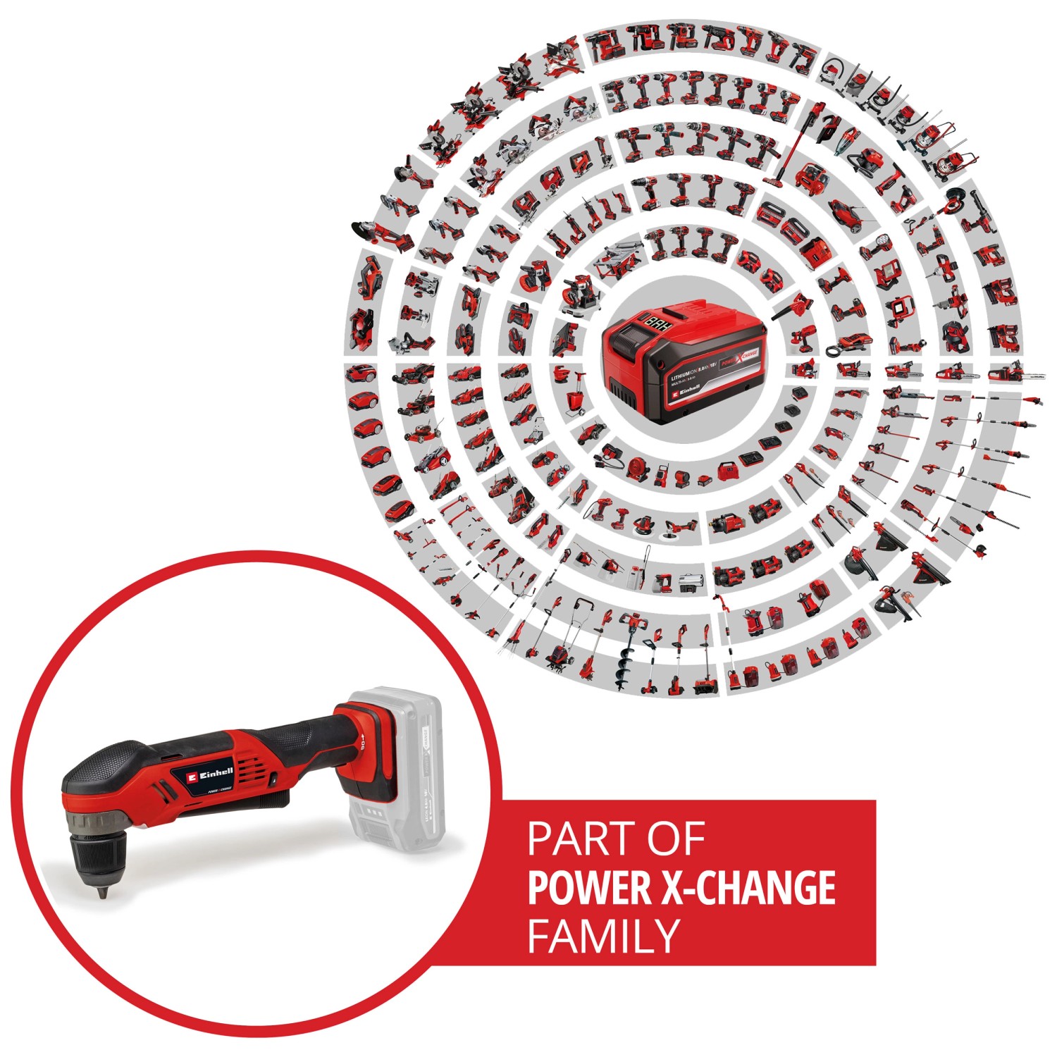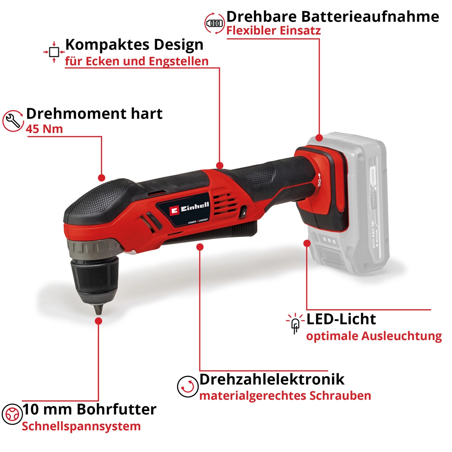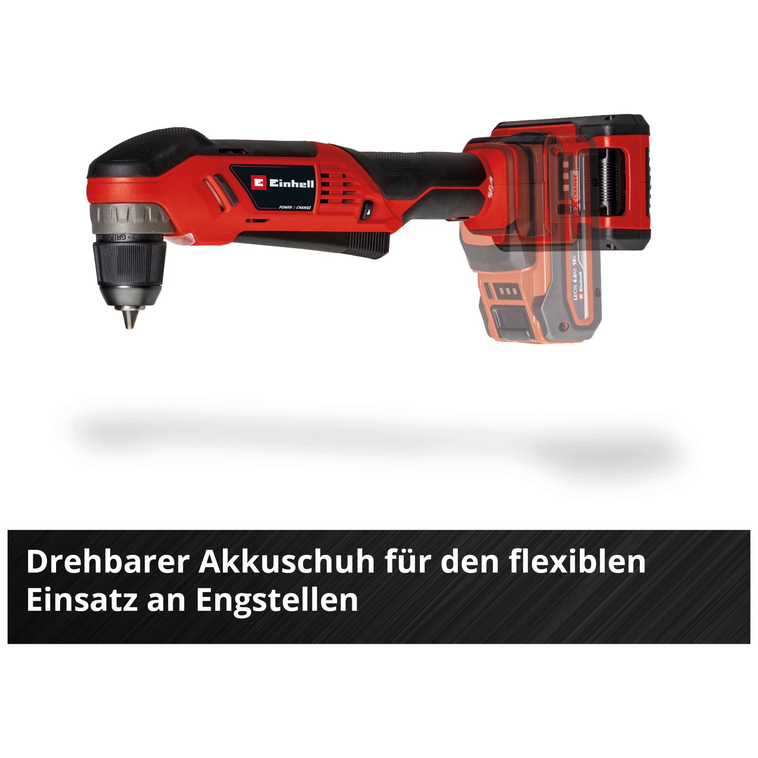 Die Einhell Akku-Winkelbohrmaschine TE-AD 18 Li ist ein praktisches Werkzeug zum Schrauben und Bohren an schwer zugänglichen Stellen. Dank ihrer kompakten Bauweise und der drehbaren Batterieaufnahme erreicht die Winkelbohrmaschine problemlos enge Bereiche und Nischen. Der grossflächige Schalter ermöglicht flexible Griffpositionen. Als Teil der Power-X-Change Familie ist die Bohrmaschine mit allen Akkus und Ladegeräten dieses Systems kompatibel. Ausgestattet ist das Gerät mit einem robusten Metallgetriebe, 45-Nm-Drehmoment, einstellbarer Drehzahl, einem 10-mm-Schnellspannbohrfutter, integriertem LED-Licht sowie Rechts- und Linkslauf.