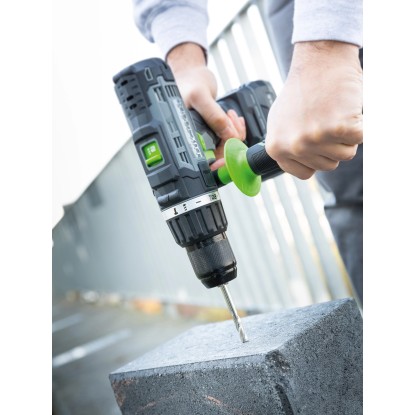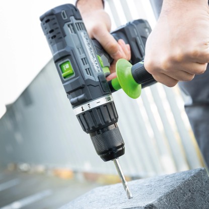 Der Schrauber verfügt über ein robustes 2-Gang-Getriebe mit einer Leerlaufdrehzahl von maximal 1´650/min (Umdrehungen). Die integrierte Schlagbohrfunktion ermöglicht eine maximale Schlagzahl von 29´700/min, womit selbst schwere Arbeiten leicht von der Hand gehen. Durch das Schnellspann-Bohrfutter mit einer Bohreraufnahme von 13 mm ist ein besonders schneller und einfacher Bohrerwechsel möglich. Mit seinem Softgrip-Handgriff liegt das Gerät angenehm in der Hand und unterstützt ein komfortables Arbeiten. Ausgestattet ist er zudem mit einem Zusatzhandgriff für noch mehr Sicherheit bei schweren Bohrarbeiten.