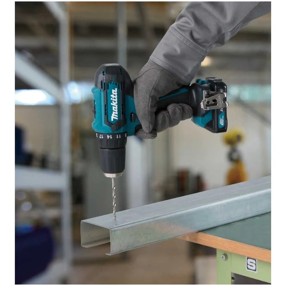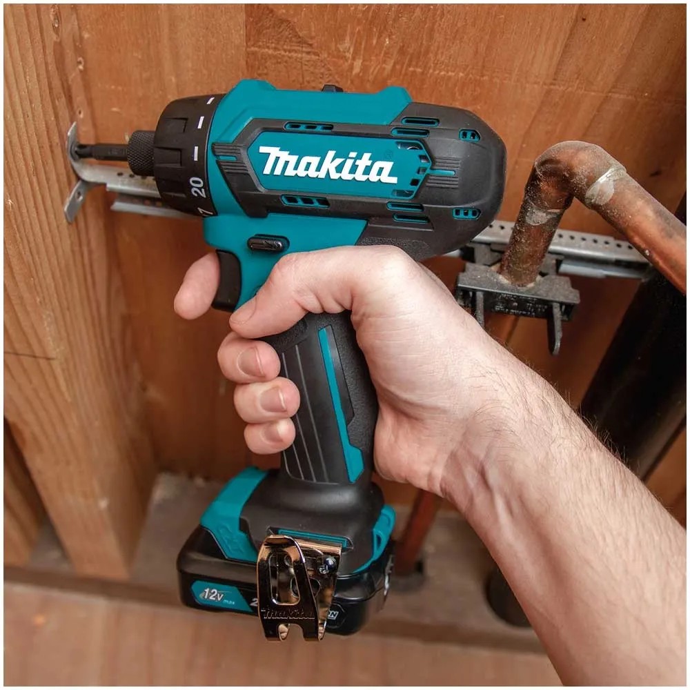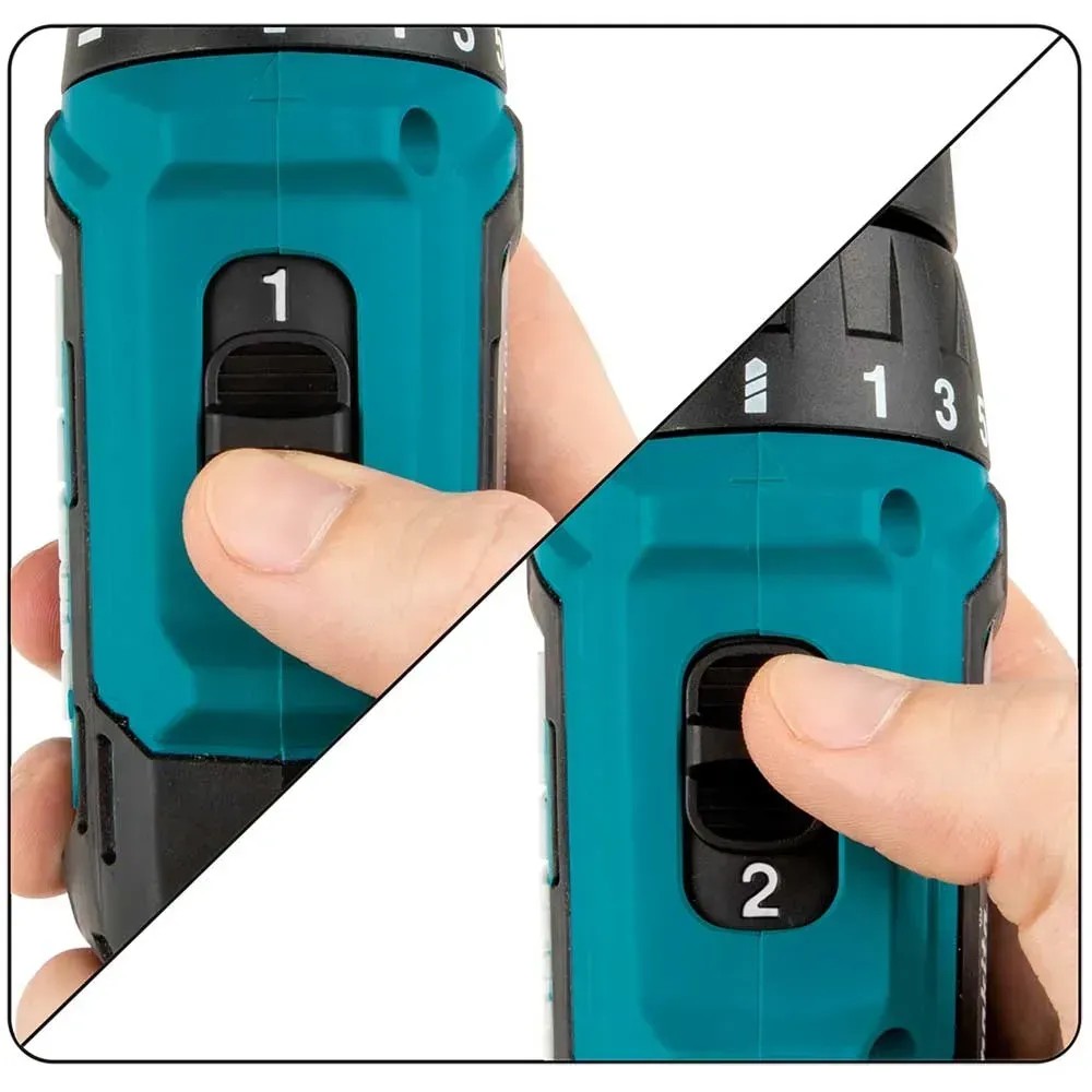 Der Makita Akku-Bohrschrauber DF333DSYJ ist ein leichtes Werkzeug zum Schrauben und Bohren in weichen und härteren Materialien. Er wird mit zwei hochwertigen Li-Ion-Akkus betrieben, die eine Spannung von 12 V und Kapazität von 1,5 Ah haben. Ausgestattet ist der Bohrschrauber mit einem Akkuschutzsystem, das die Stromversorgung bei niedrigem Batteriestand automatisch abschaltet. Die Leerlaufdrehzahl liegt bei 0 - 1'700 U/min. Mit 21 Drehmomentstufen erzielt der Bohrschrauber maximales Drehmoment von 20 Nm. Um ein ungewolltes Nachlaufen des Bohrfutters zu verhindern, ist er mit einer Quick-Stop-Funktion ausgestattet. Durch die langlebige LED-Leuchte ermöglicht der Akku-Bohrschrauber eine effiziente Ausleuchtung der Arbeitszone für eine gute Sicht.