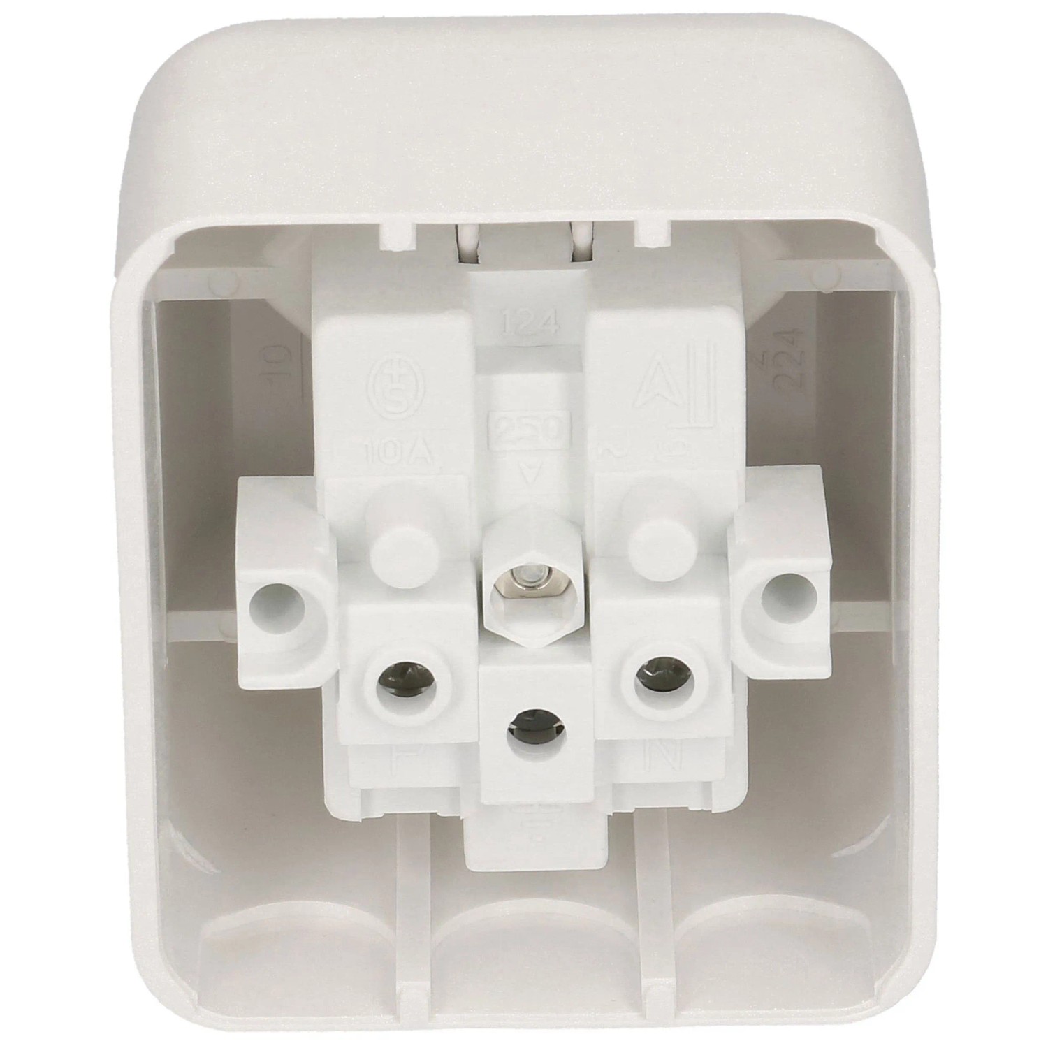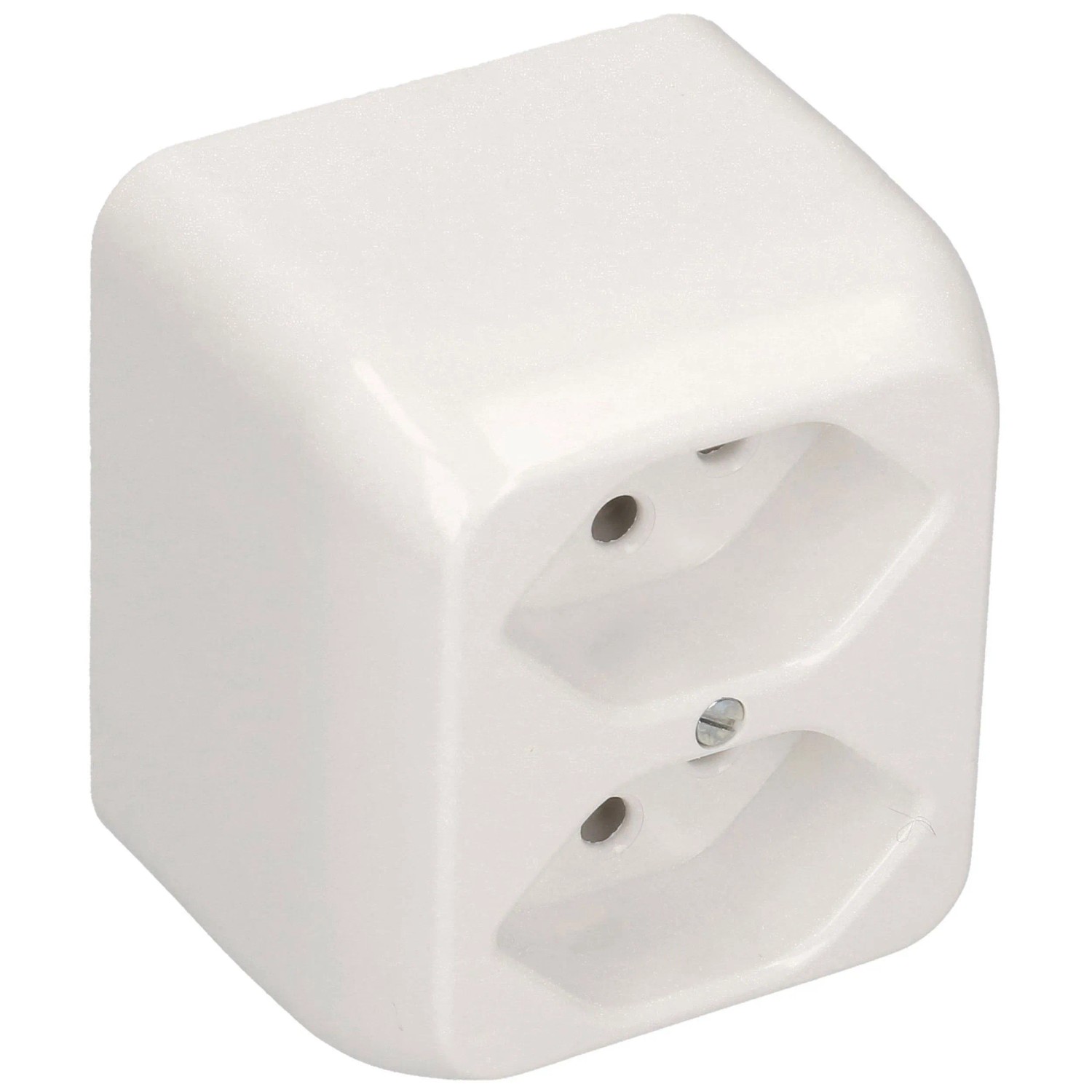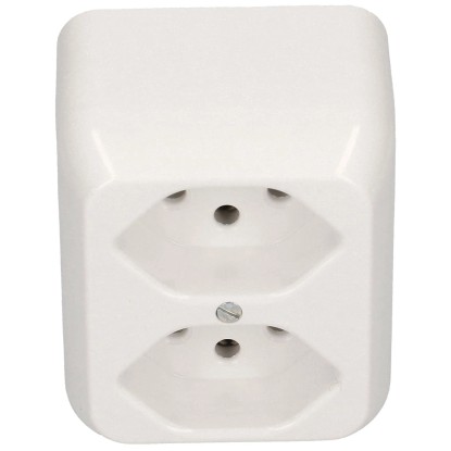 Die weisse Aufputzsteckdose mit der Grösse 1 hat 250 V und 10 A. Steckdosentyp: 2 x Typ 13 parallel.