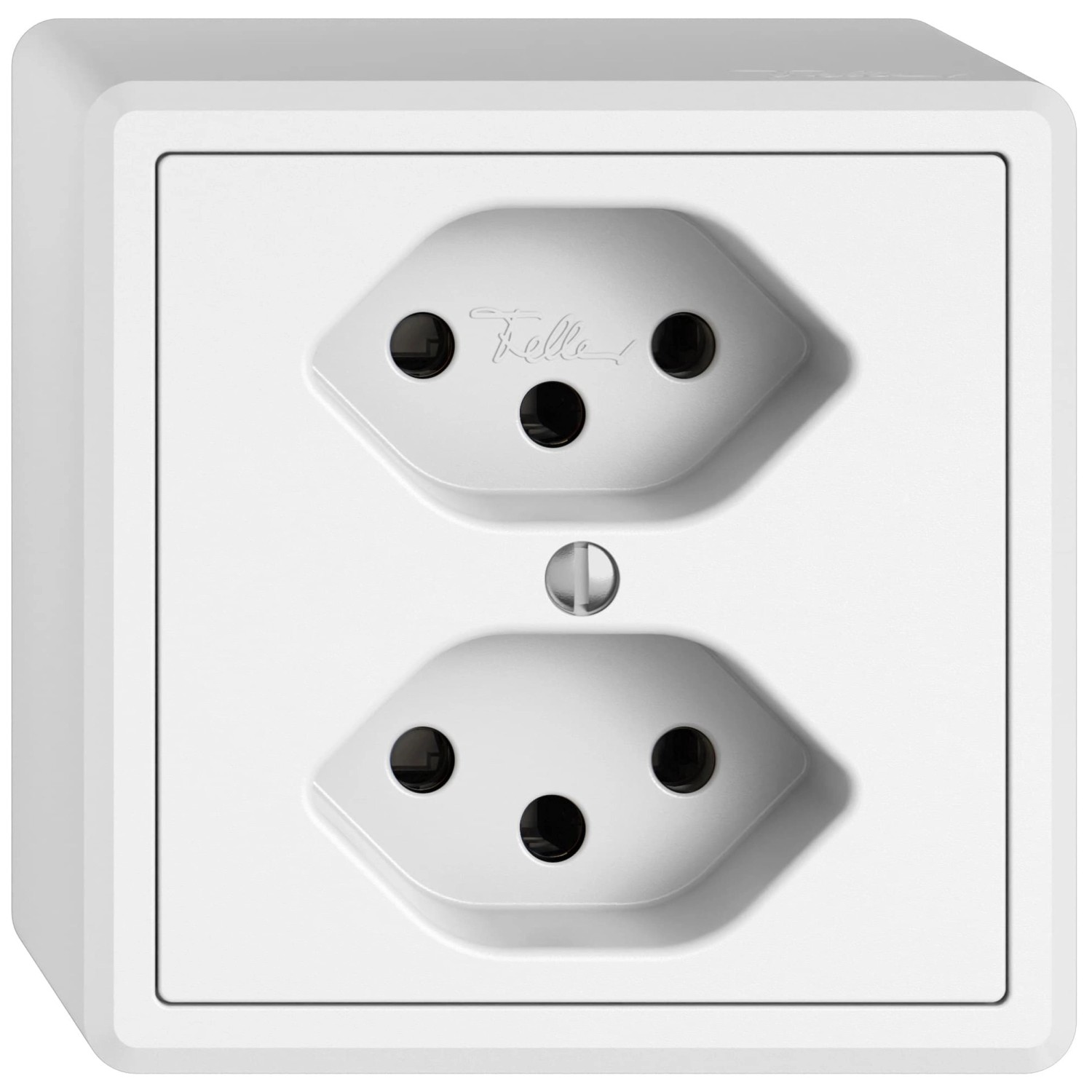 Die Steckdose in Weiss aus der Designserie Edizio.liv von Feller eignet sich für die Aufputzinstallation. Sie bietet zwei T13-Steckplätze und ist für eine Spannung von 250 V und eine Stromstärke von 10 A ausgelegt.