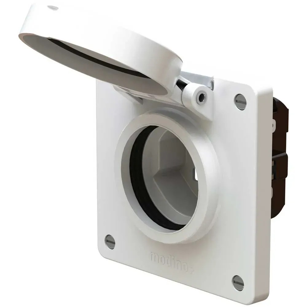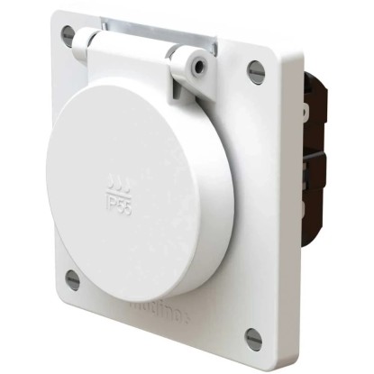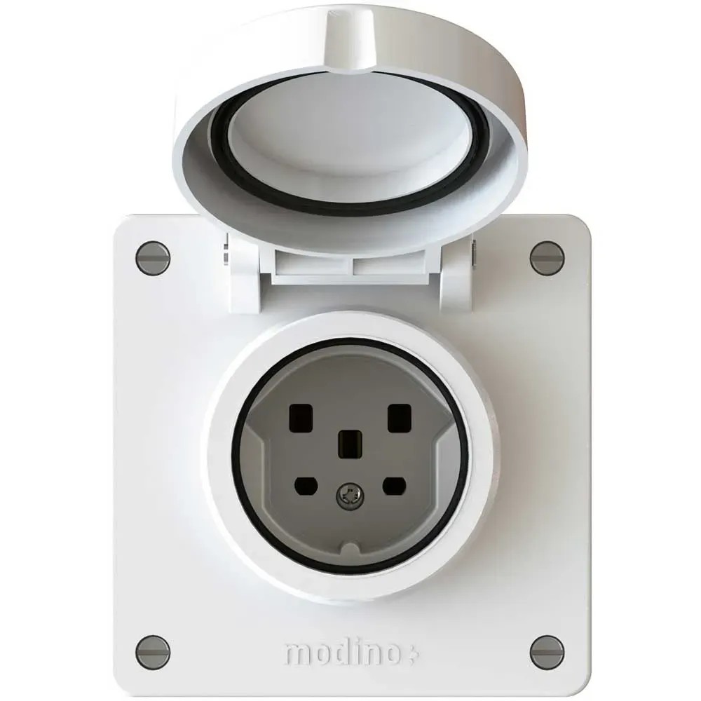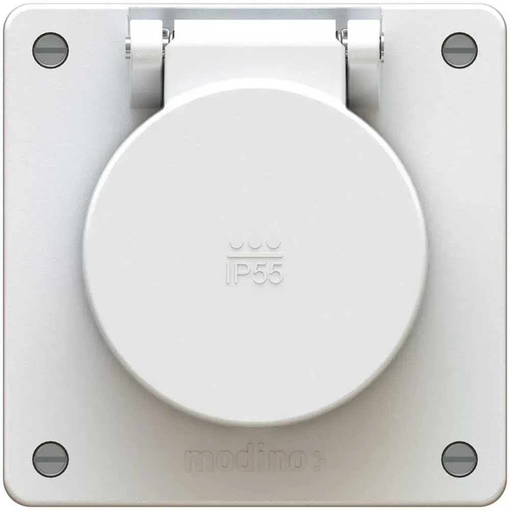 Das Steckdosen- und Schalterprogramm Modino Exo steht für Sicherheit und Ästhetik im anspruchsvollen Umfeld. Die Schutzart IP55 umfasst sowohl den vollständigen Staub- und Berührungsschutz (IP5X) als auch den Schutz gegen Strahlwasser (IPX5). Der Schutz ist sowohl bei eingestecktem IP55-Stecker als auch bei geschlossenem Klappdeckel gewährleistet. Typische Einsatzgebiete sind im Gelände, im Gewerbe und am Gebäude, da dort die Sicherheit bei der Anwendung von Hochdruckreinigern, Industriesaugern, Wasserpumpen und vielem mehr wichtig ist.