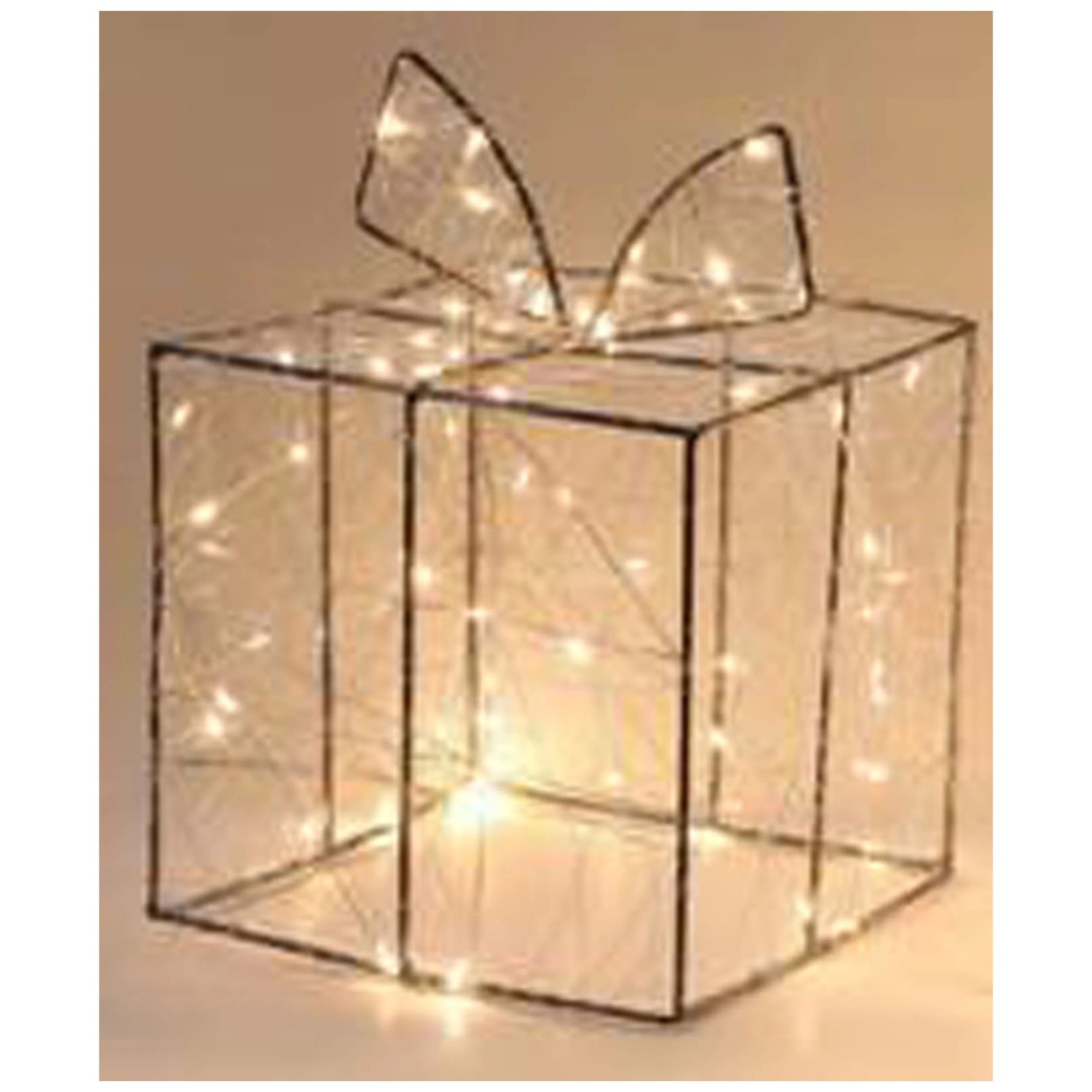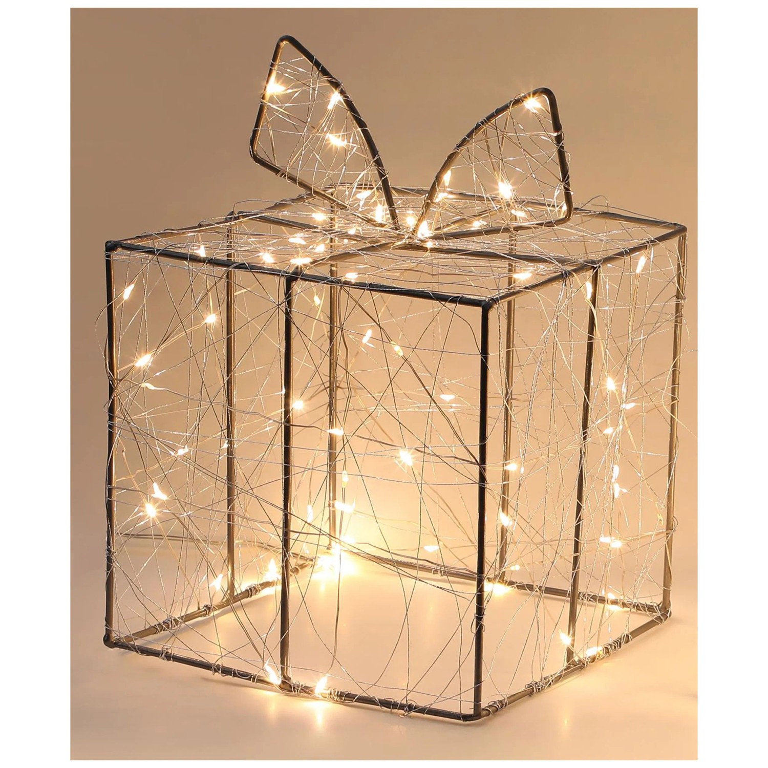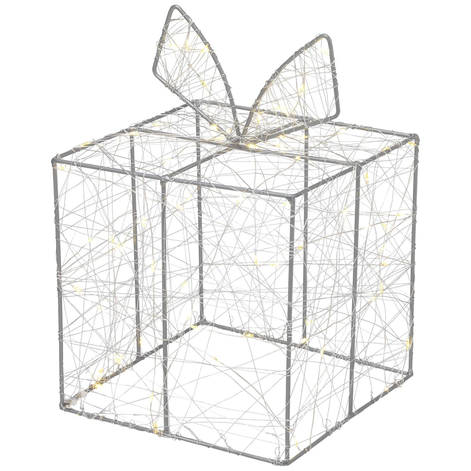 Die Drahtfigur in Geschenkform ist mit einem Lichterdraht mit 40 warmweissen LED-Lichtern umwickelt. Die Lichtfigur kreiert dadurch eine angenehme Atmosphäre während der festlichen Zeit.