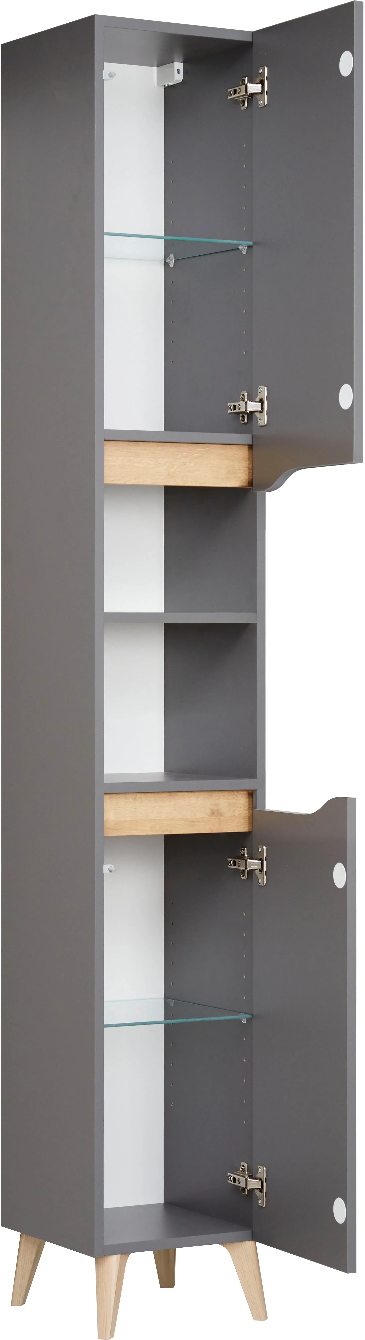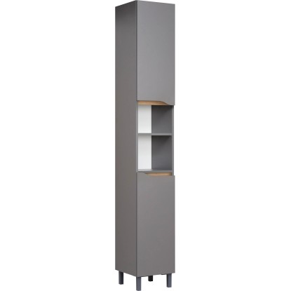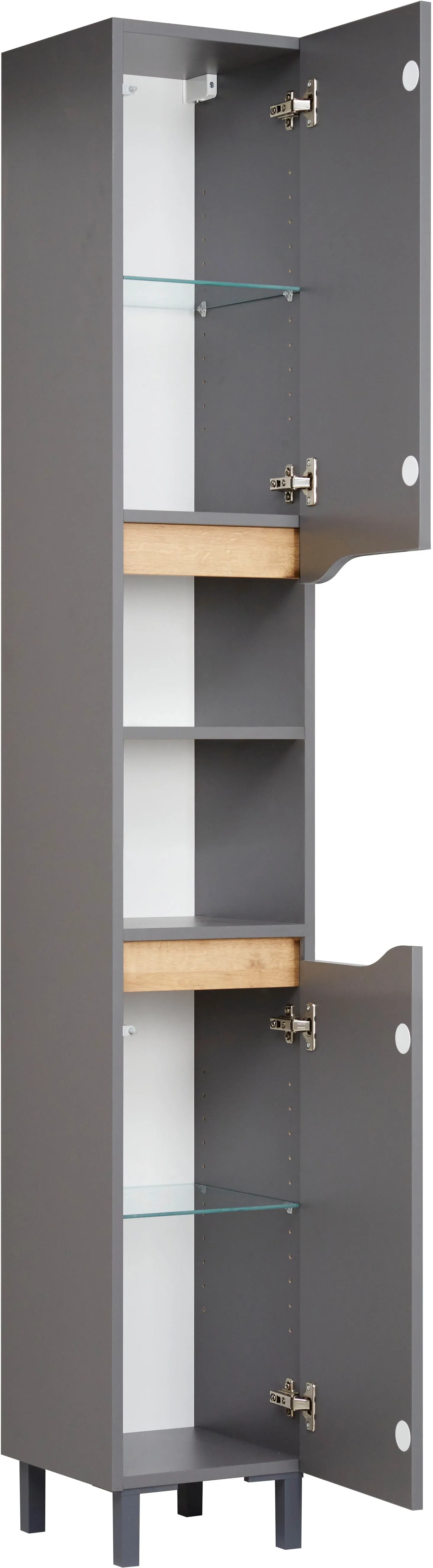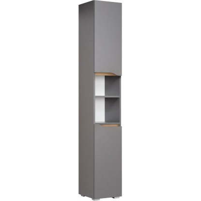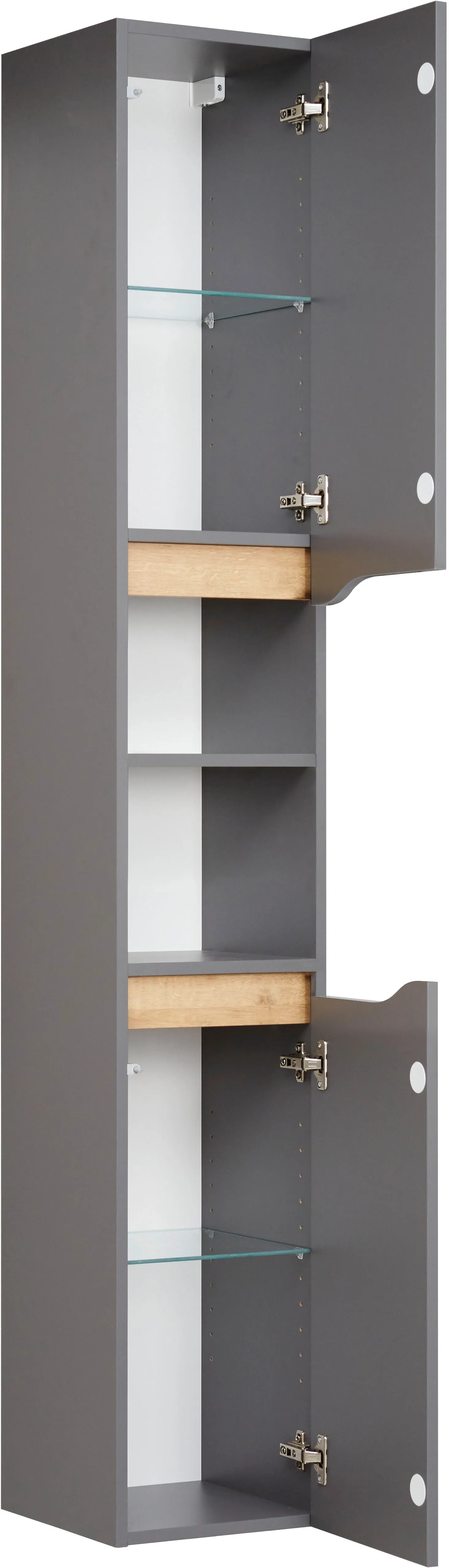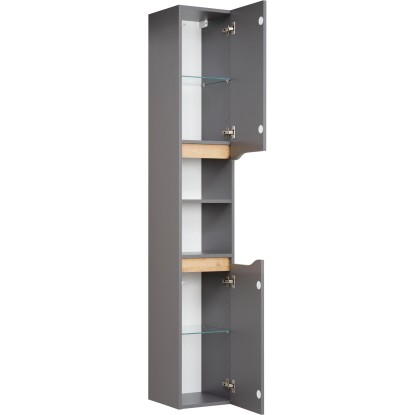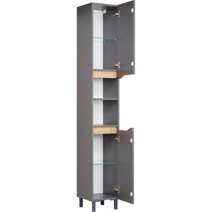 Der moderne Hochschrank überzeugt neben der ansprechenden Optik auch mit seiner hohen Funktionalität. Er ist mit zwei Drehtüren, zwei Einlegeböden aus Glas und einer Nische ausgestattet und bietet viel Platz für die optimale Aufbewahrung von Handtüchern & Co. Die zwei Schranktüren sind mit gedämpften Scharnieren ausgestattet und schliessen dadurch sanft und besonders leise.