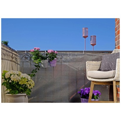 Diese attraktive, wetterfeste Balkonbespannung verschafft Ihnen in nur wenigen Minuten den gewünschten Sichtschutz. Die Balkonverkleidung in der neuen Trendfarbe Beigegrau meliert passt als dezenter und freundlicher Hintergrund gut zu allen Balkonmöbeln. Mit ein paar Blumen oder Grünpflanzen entsteht ein gemütlicher Sitzplatz. Für die faltenfreie, windsichere und unkomplizierte Befestigung am Balkongeländer werden Befestigungsschlaufen empfohlen.