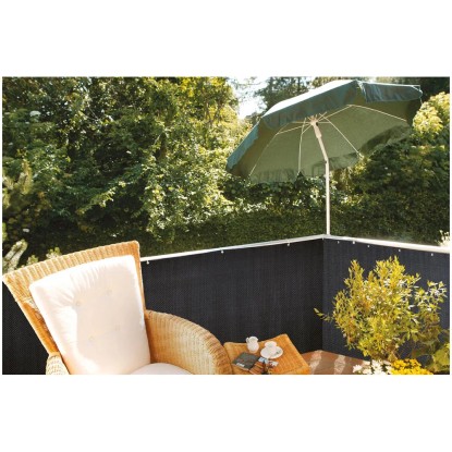 Das Webmuster verleiht der Balkonbespannung eine tolle Optik, ähnlich den aktuellen Geflechtmöbeln aus Poly-Rattan. Die changierende Oberfläche wirkt edel. Die Kunststoffbespannung ist flexibel genug um einer Balkonecke zu folgen, aber rigide genug um nicht im Wind zu flattern. Die Balkonverkleidung kann leicht mit Befestigungsschlaufen am Balkongitter fixiert werden. Das Kunststoffgeflecht hat offene Maschen, durch die zusätzlich Befestigungsschlaufen (Kabelbinder, Draht) geführt werden können, dabei den Abstand zum Rand grosszügig bemessen. Diese zusätzliche Fixierung empfehlen wir, damit die Windlast vermindert wird. Alle 50 cm sind nicht-rostende Ösen in das Gewebe eingeschlagen. Der Schmutz unempfindliche Balkon-Sichtschutz kann einfach mit Wasser abgewaschen werden.
