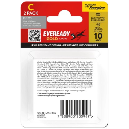 Die Energizer Alkaline-Batterie Eveready Gold C Baby eignet sich ideal für vielfältige Anwendungen wie z.B. Spielzeug, Fernbedienungen, div. Taschenlampen ohne Quecksilber, ohne Cadmium.