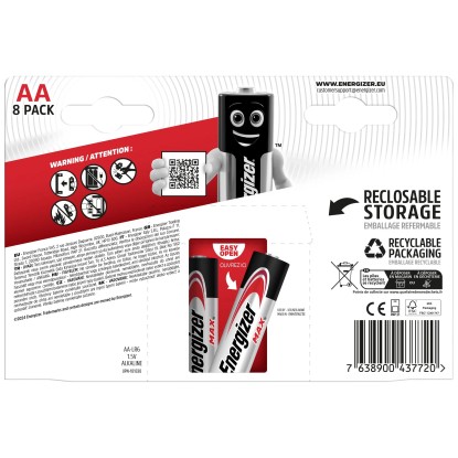 Energizer Max unsere Premium-Alkali-Batterie für zuverlässige und langlebige Leistung. Die innovative Energizer PowerSeal-Technologie speichert Energie 10 Jahre lang und bietet Ihnen die Leistung, die Sie benötigen, wann immer notwendig. Energizer Max Batterien eignen sich für alle Geräte des täglichen Gebrauchs. Energizer Max wurde entwickelt, um Ihre Geräte vor Auslaufschäden zu schützen. Verlassen Sie sich für Ihre Spielzeuge, Digitalkameras und andere hochwertige Geräte auf die langlebige Leistung und den Geräteschutz, den Sie von Energizer erwarten.