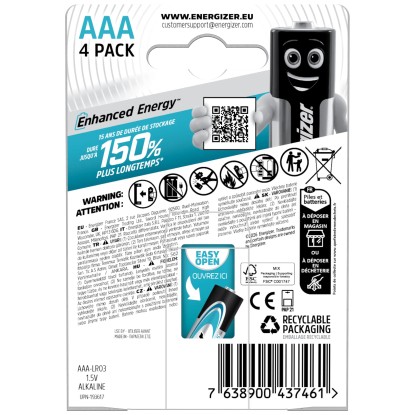 Energizer Max Plus ist die leistungsstärkste Alkali-Batterie bei AA- und AAA-Grössen aus dem Energizer-Sortiment und bietet langlebige Leistung für Ihre anspruchsvollen Geräte. Max Plus-Batterien haben eine bis zu 13 % längere Lebensdauer gegenüber Energizer EcoAdvanced AA-Alkaline-Batterien (getestet in Kinderspielzeug) und sind somit ideal für langanhaltende Leistung in Ihren am häufigsten verwendeten Geräten. Dies schont die Umwelt, denn wenn die Batterien seltener auszuwechseln sind, erzeugen Sie weniger Abfall. Energizer Max Plus erhält die Leistung über eine Lagerzeit von bis zu 12 Jahren. Die Batterien sind einsetzbar in einem gängigen Temperaturbereich von -18 °C bis +55 °C.
