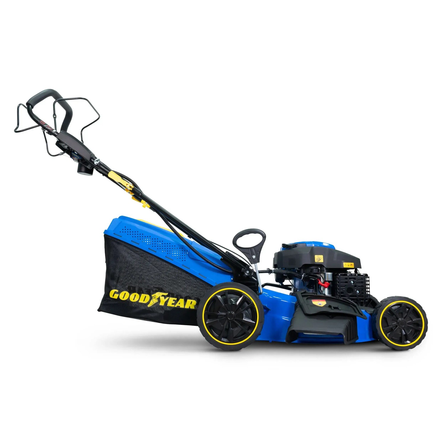 Der Goodyear Rasenmäher GY531LME mit Benzinantrieb verfügt über einen 225-ccm-Motor und einen Elektrostart per Knopfdruck. Das Design in Blau wird durch gelbe Akzente ergänzt. Der Rasenmäher hat ein stabiles Fahrgestell, grosse Räder und einen ergonomisch geformten Führungsholm für eine angenehme Handhabung. Die Fangbox erleichtert das Sammeln des Schnittguts. Die Bedienung erfolgt über das Bedienfeld am Griff. Im Lieferumfang ist ein Akku für den Elektrostart enthalten.