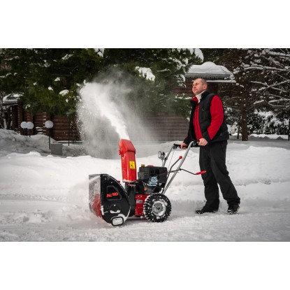 Die kraftvollen Motoren der Schneefräse mit 4,4 kW und 212 ccm Hubraum bieten durch die OHV-Technologie (overhead valves) mit oben liegenden Ventilen einen hervorragenden Wirkungsgrad, was sich durch sparsamen Verbrauch bemerkbar macht. Die Räumbreite beträgt 62 cm, die Schnee-Einzugshöhe beträgt bis zu 51 cm, und je nach Beschaffenheit wird der Schnee bis zu 15 m weit durch den drehbaren Auswurfschacht geworfen. Der Radantrieb erfolgt davon unabhängig, sodass die Schneefräse immer weiterbewegt und konstant Schnee räumt. Mit der Stollenbereifung ist dabei auch bei widrigen Bedingungen für gute Traktion und leichte Manövrierfähigkeit gesorgt. Durch den wintertauglichen, starken OHV-Motor und den zuschaltbaren Radantrieb mit fünf Vorwärts- und zwei Rückwärtsgängen ist die zweistufige (Schnecke und Wurfrad) Schneefräse Snowline 620 E II besonders einfach zu handhaben. Der eingebaute Scheinwerfer und die Möglichkeit, den Motor wahlweise via Seilzug oder 230-V-Elektrostart in Gang zu setzen ist besonders praktisch an den dunklen Wintertagen.