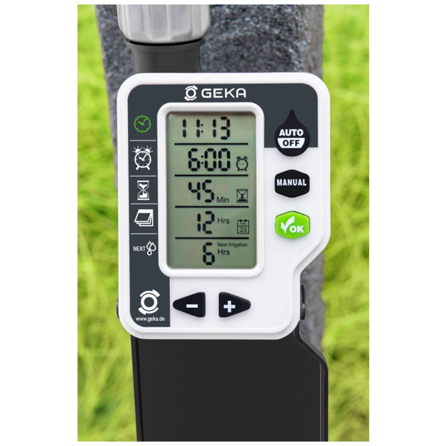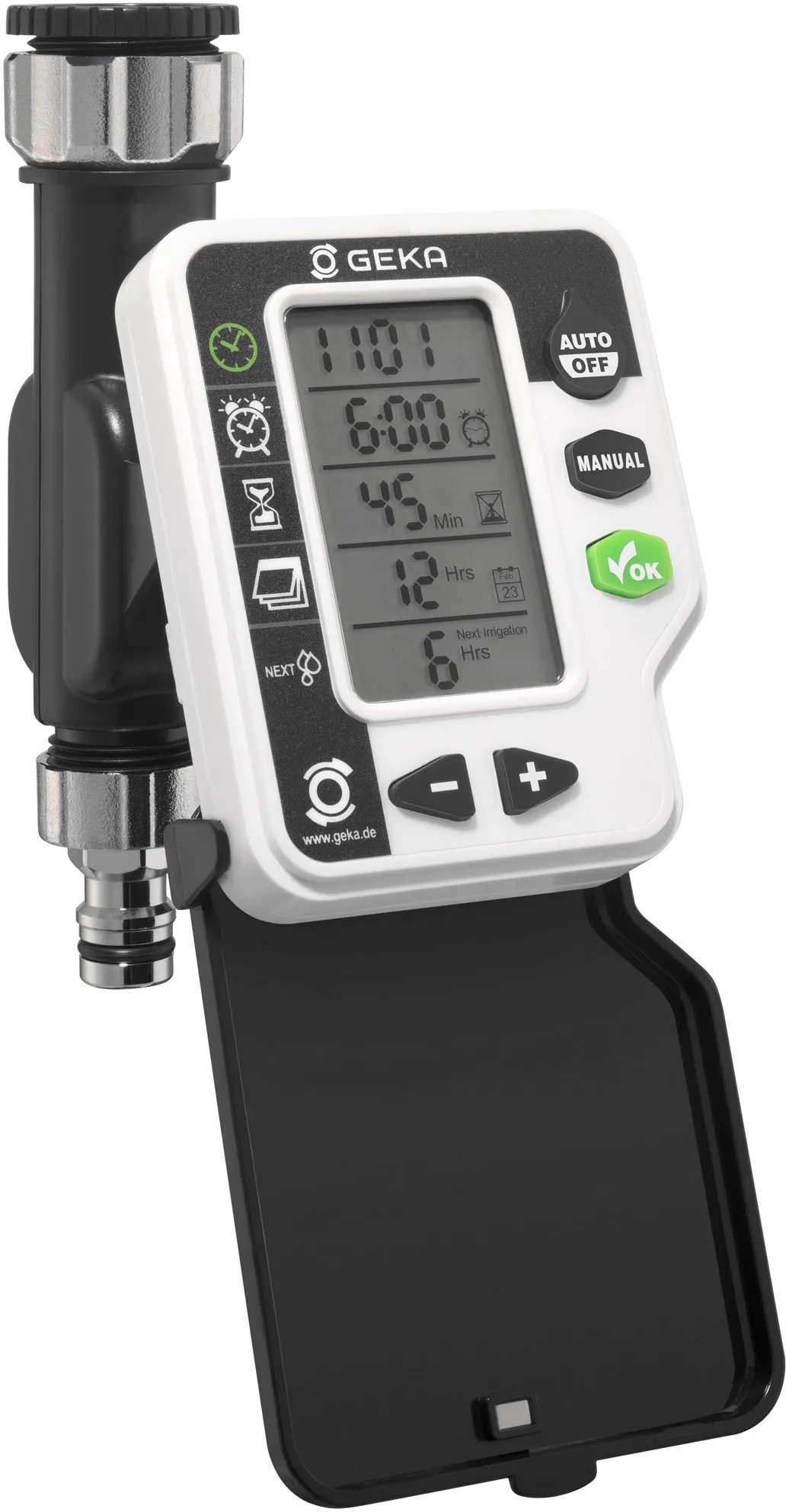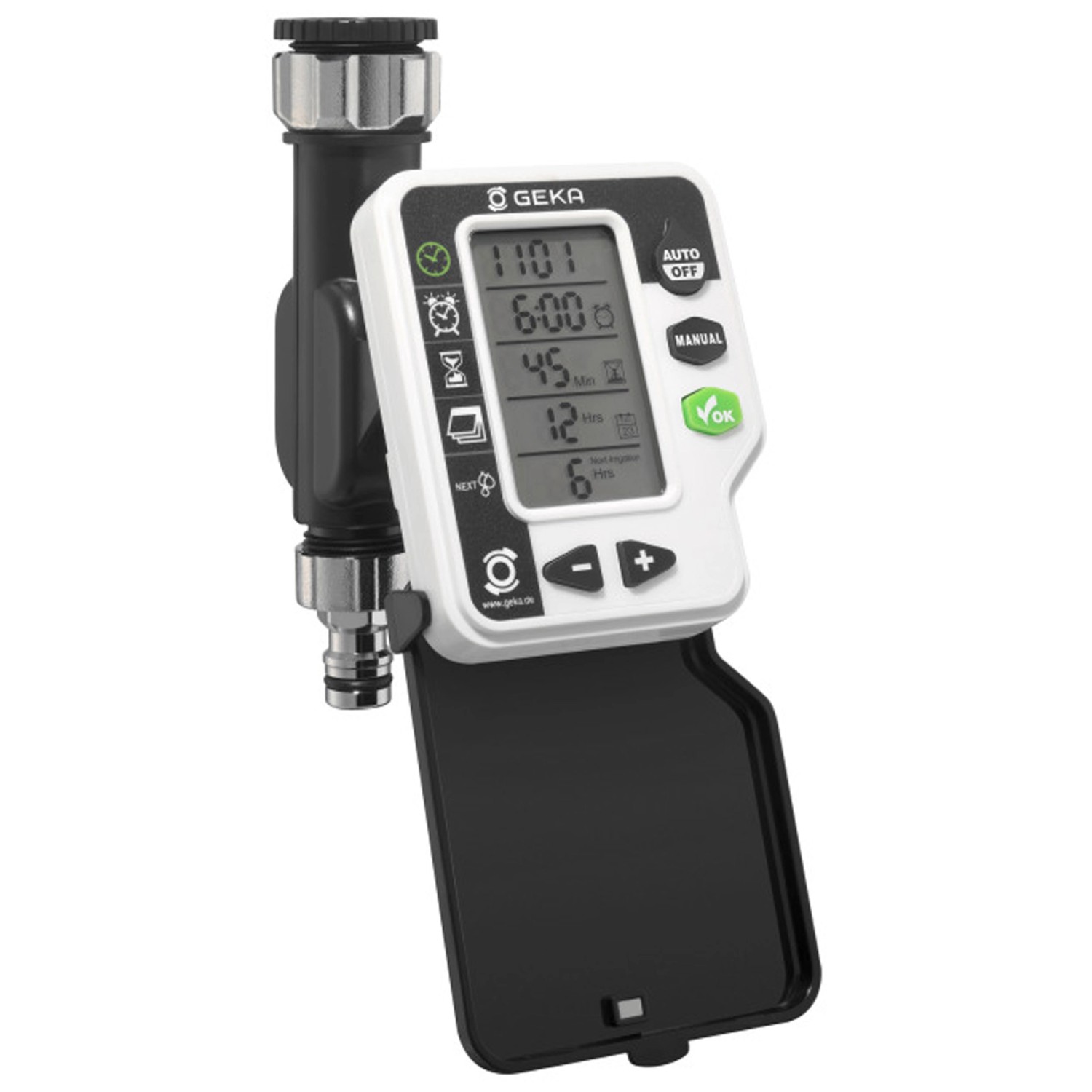 Mit diesem digitalen Bewässerungscomputer von Geka werden Garten, Beete und Topfpflanzen zuverlässig bewässert, auch wenn Sie nicht zuhause sind. Mit seinem abnehmbaren Bedienteil lässt er sich einfach installieren und programmieren. Die Bewässerungszeit kann von 1 - 240 min eingestellt werden, wobei die Startzeit exakt auswählbar ist. Die Bewässerungszeiten sind pro Tag bis zu vier Mal einstellbar. Mit der Safe Water Stop Funktion wird unnötige Wasserverschwendung vermieden. Die Dauerbewässerung ist über die Manual-Einstellung möglich.