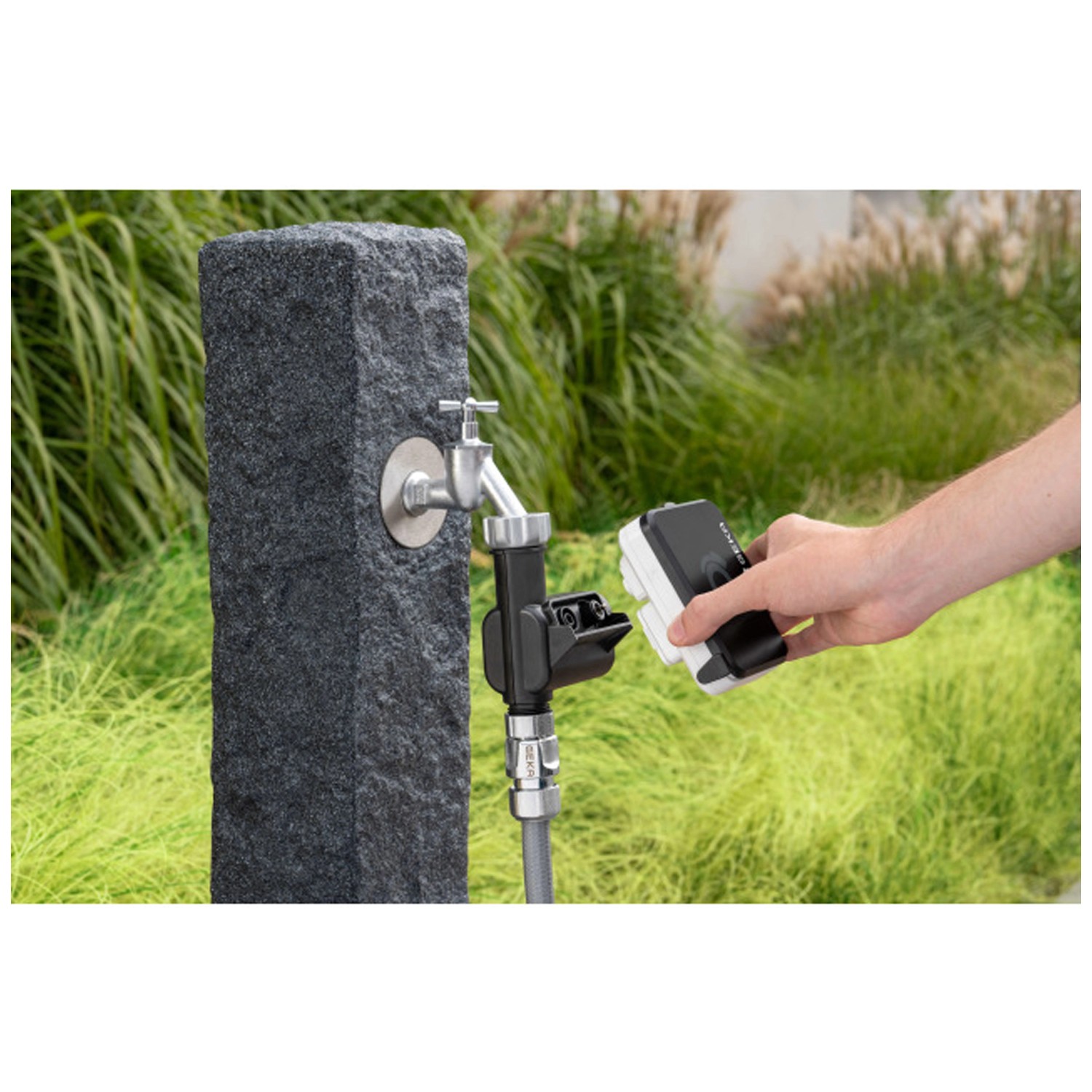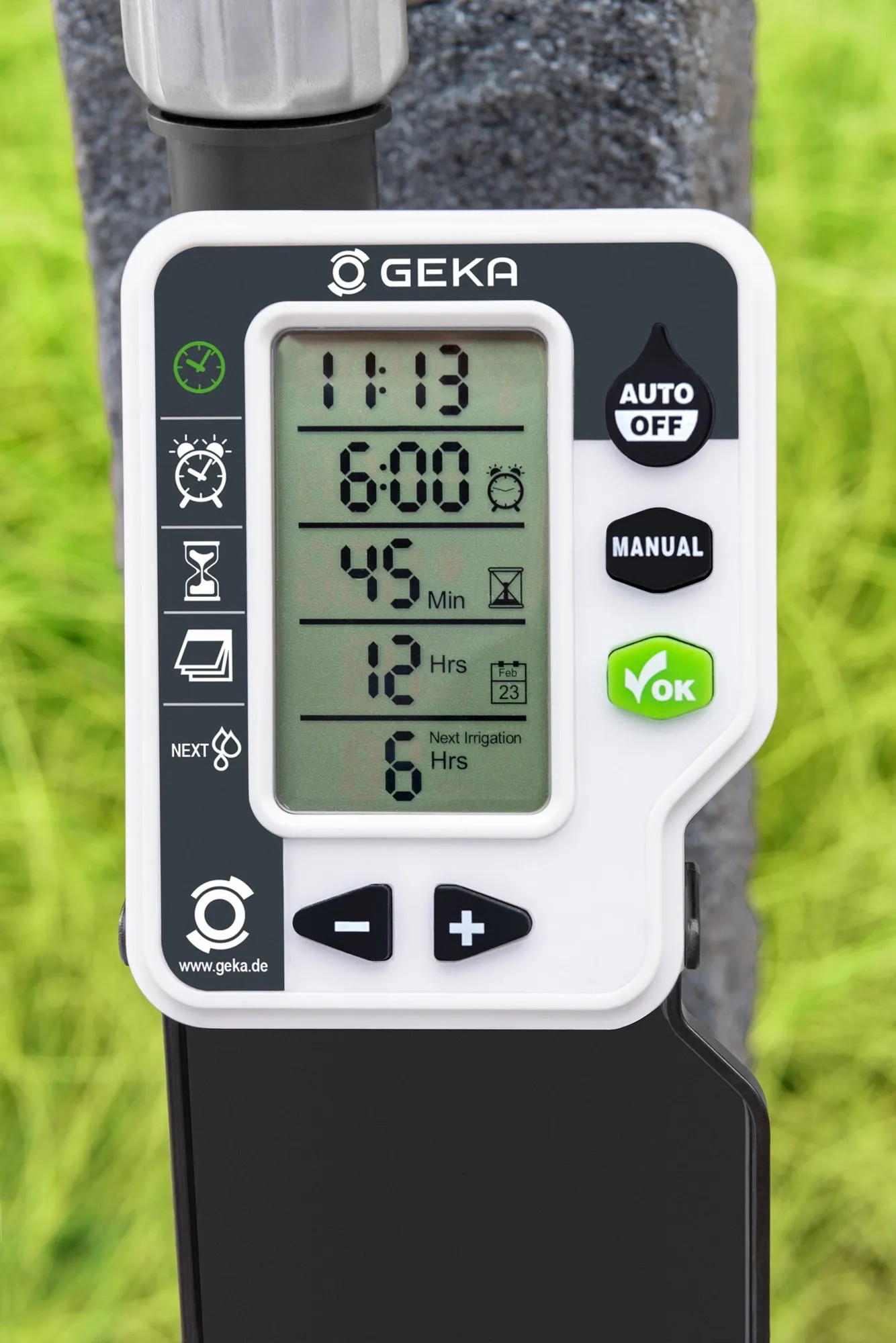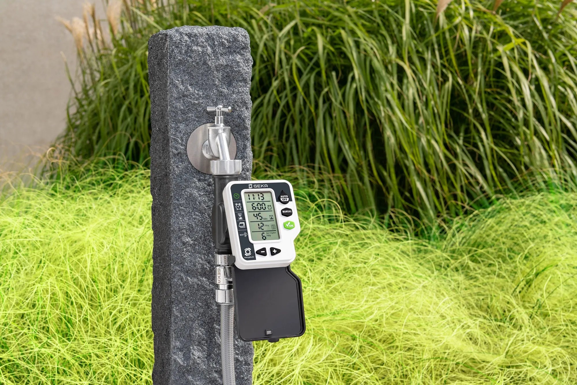 Mit diesem digitalen Bewässerungscomputer von Geka werden Garten, Beete und Topfpflanzen zuverlässig bewässert, auch wenn Sie nicht zuhause sind. Mit seinem abnehmbaren Bedienteil lässt er sich einfach installieren und programmieren. Die Bewässerungszeit kann von 1 - 240 min eingestellt werden, wobei die Startzeit exakt auswählbar ist. Die Bewässerungszeiten sind pro Tag bis zu vier Mal einstellbar. Mit der Safe Water Stop Funktion wird unnötige Wasserverschwendung vermieden. Die Dauerbewässerung ist über die Manual-Einstellung möglich.