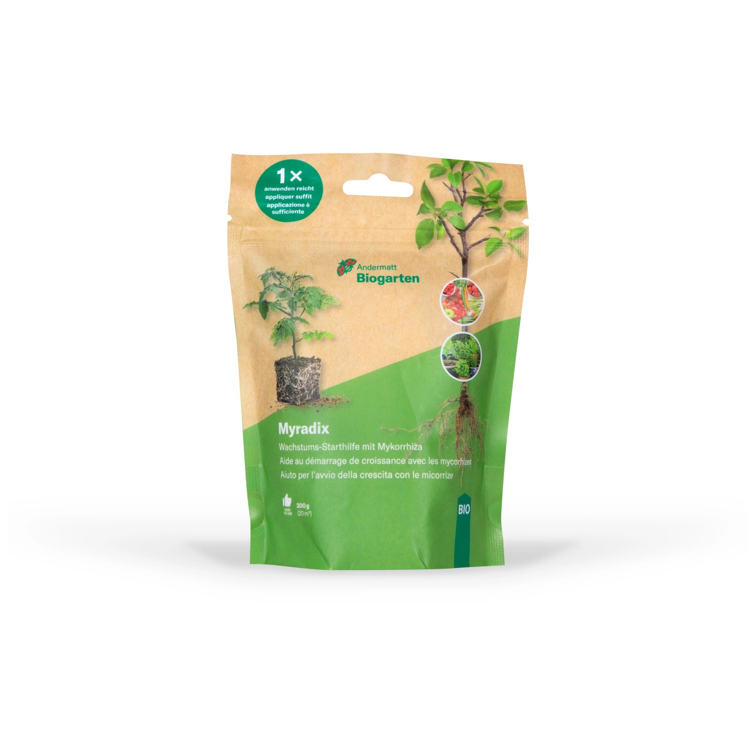 Myradix enthält natürliche Kulturen von mehreren Mykorrhiza-Pilzen. Diese gehen mit den Pflanzen eine langlebige symbiotische Beziehung ein und bilden feine Pilz-Wurzeln (Hyphen) aus. Die Pflanzenwurzeln werden so verlängert und die Aufnahme von Nährstoffen und Wasser verbessert. Zudem werden gebundene Nährstoffe und Mineralien für Pflanzen verfügbar gemacht. Mit Myradix zeigen Pflanzen ein deutlich verbessertes Wachstum.