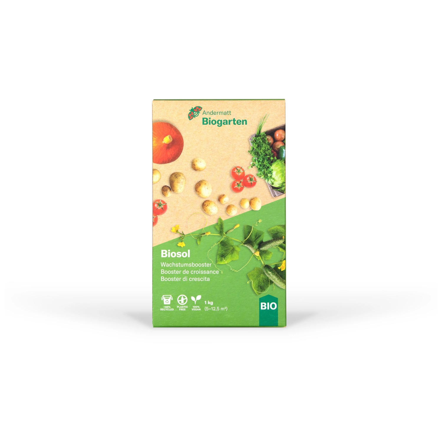 Biosol ist ein natürlicher Festdünger mit Langzeitwirkung, der universal einsetzbar ist. Er eignet sich ganz besonders für starkzehrende Pflanzen wie z. B. Tomaten, Kartoffeln, und Mais. Er erhöht die Bodenfruchtbarkeit und drängt viele Schadpilze zurück. Ausserdem fördert Biosol den Humusaufbau sowie die Bodenstruktur und verbessert das Wasserhaltevermögen des Bodens.