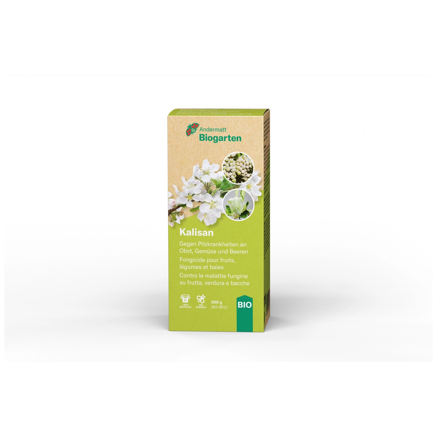 Kalisan dient als vorbeugende Massnahme gegen Pilzkrankheiten. Es ist biologisch und beugt gegen Schorf, Echten Mehltau und Regenflecken bei Obst, Beeren und Reben vor. Bei starkem Befall wird die kombinierte Anwendung mit MycoSan-S empfohlen.