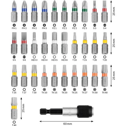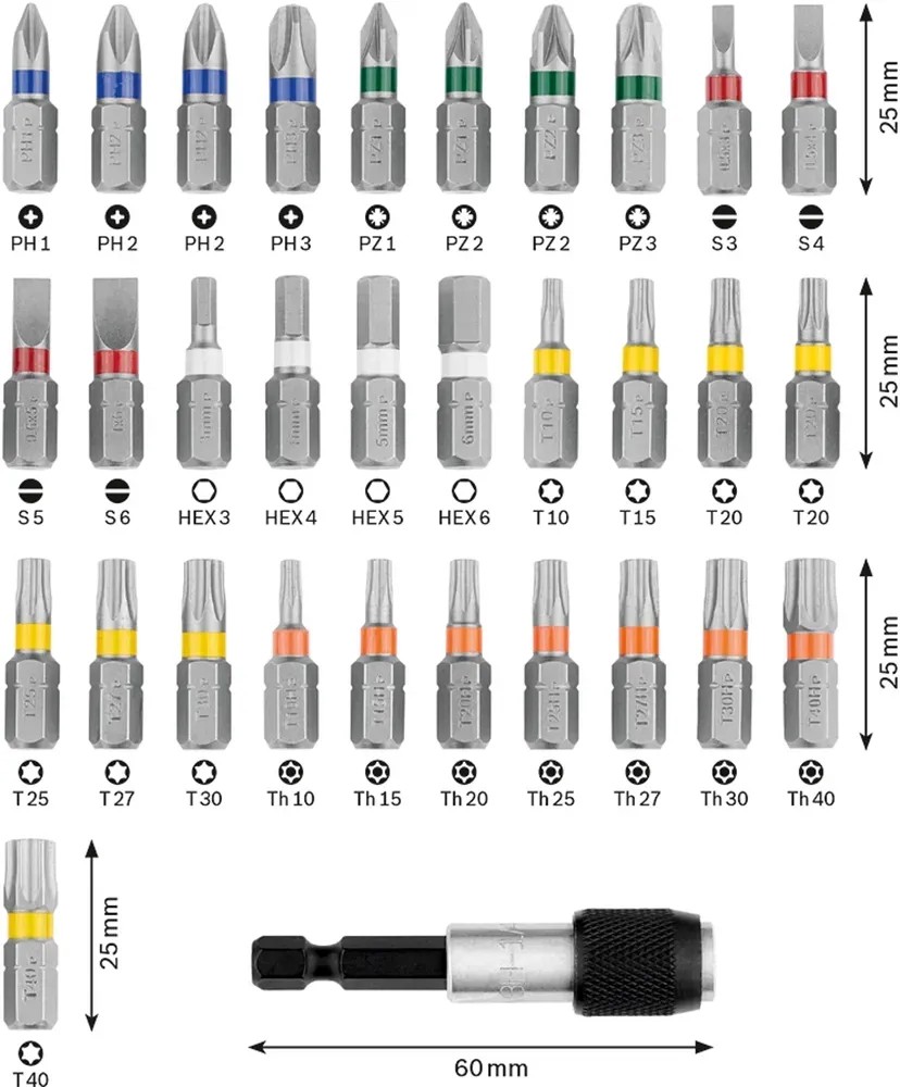 Bosch Schrauberbit-Set mit farbcodierten Schrauberbits, geeignet für alle gängigen Schraub- und Montagearbeiten. 31 Schrauberbits mit Farbcodierung und einer Länge von 25 mm (PH1, PH2, PH2, PH3, PZ1, PZ2, PZ2, PZ3, S3, S4, S5, S6, HEX3, HEX4, HEX5, HEX6, T10, T15, T20, T20, T25, T27, T30, T40, TH10, TH15, TH20, TH25, TH27, TH30, TH40) und 1 Schnellwechsel-Universalhalter.