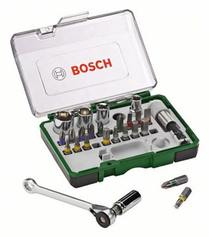 Das 27-teilige Bosch Schrauberbit- und Ratschen-Set Promoline ist ein hochwertiges Set mit farbcodierten Schrauberbits, gängigen Steckschlüsseln und Ratsche für unterschiedliche Schraub- und Montagearbeiten. Ein sicherer Halt und ein schneller Wechsel der Bits wird durch die Verriegelungs- und Schnellwechselfunktion des Universaladapters ermöglicht.