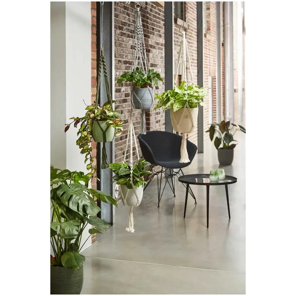 Die Knüpftechnik Macramee erlebt aktuell eine Renaissance. Diese Hängeampel in der angesagten Knüpftechnik verbindet die Trends Green Living und Vertical Gardening miteinander. Als Blumenampel konzipiert, schaffen die Macramees eine dekorative Raumbegrünung und sind auch als Raumtrenner ein Blickfang.