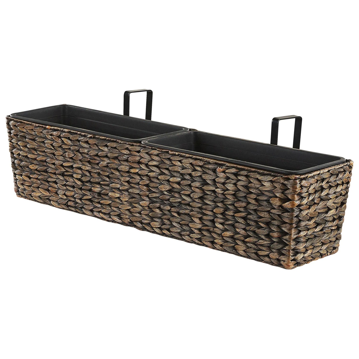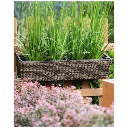 Der rechteckige Pflanzkübel aus der Serie Kawala ist aus natürlicher Wasserhyazinthe gefertigt und eignet sich für den Innen- und Aussenbereich. Er ist UV- und witterungsbeständig, strapazierfähig sowie schädlings- und pilzresistent. Der Pflanzkasten ist mit zwei formstabilen Einsätzen ausgestattet, die den Kübel vor Wasser und Wurzelwachstum schützen. Die Griffe sind abnehmbar, wodurch der Kübel auch als Fensterbank-Pflanzkasten genutzt werden kann. Mit einem Volumen von 8,4 Litern bietet er ausreichend Platz für Ihre Pflanzen. Der Pflanzkübel ist dekorativ und funktional, speziell für den Aussenbereich entworfen und besonders pflegeleicht.