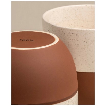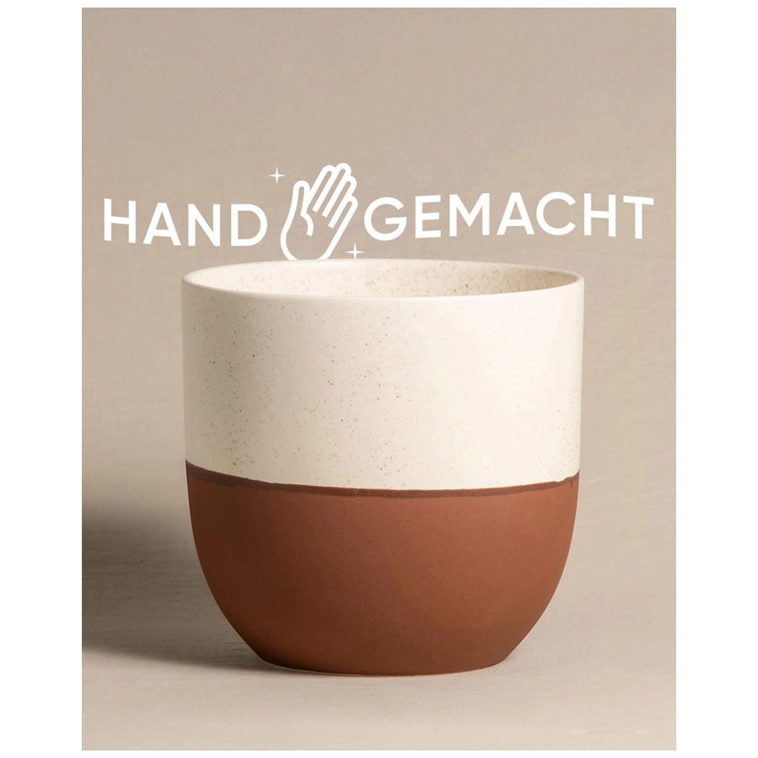 Der feey Keramik-Topf Variado ist ein handgefertigter Übertopf aus Keramik, der in Portugal mit viel Liebe hergestellt wird. Er besticht durch sein pastellfarbenes Design in Rotbraun-Weiss und eine raue, matte Oberfläche, die eine natürliche Ästhetik vermittelt. Der Topf ist wasserdicht und eignet sich ideal für Zimmerpflanzen, wobei er nicht für den Aussenbereich vorgesehen ist. Der Übertopf verfügt über kein Abtropfloch, weshalb ein passender Innentopf mit 21 cm Durchmesser und 19,5 cm Höhe zusätzlich benötigt wird. Die sorgfältige Verarbeitung und die Spezialverpackung sorgen für einen sicheren Versand und machen den Topf zu einem einzigartigen Zuhause für Ihre Pflanzen.