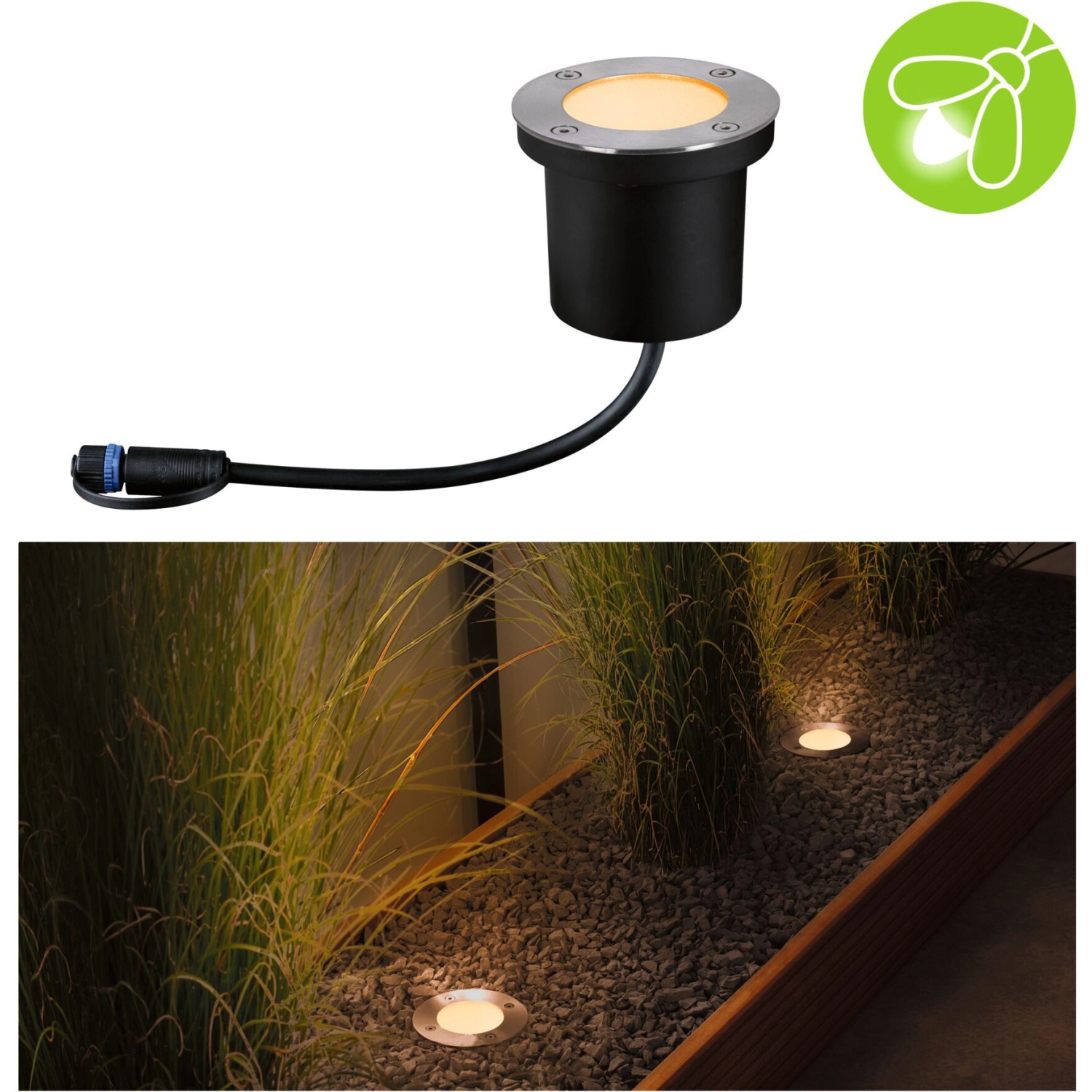 Der Paulmann LED-Outdoor-Bodeneinbaustrahler Floor Plug & Shine Ø 9,8 cm sorgt für dekorative warmweiße Lichtpunkte an Weg- oder Terrassenbegrenzungen. Der Strahler mit einer Lichtfarbe von 2'200 K ist besonders insektenfreundlich, denn dieser Wert liegt ausserhalb des sichtbaren Bereiches für Insekten, somit werden diese nicht von der zusätzlichen Lichtquelle angezogen. Die Leuchte schützt die Insekten aktiv, ohne dabei den Nutzen für den Menschen zu vernachlässigen. Das warme Goldlicht schafft eine angenehme Stimmung rund ums Haus.