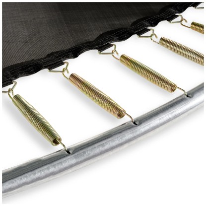 Ein 103 cm hohes Premium-Sicherheitsnetz mit überlappendem Eingang sorgt für zusätzliche Sicherheit. Der galvanisierte und pulverbeschichtete Rahmen gewährleistet eine lange Lebensdauer. Das Trampolin mit Exit Foot Protection System wird mit einem extra dicken Schutzrand geliefert, der mit einer wasserabweisenden PVC-Schicht versehen ist. Die Glasfiberringe und gebogenen Rohre halten das Sicherheitsnetz straff in Form.