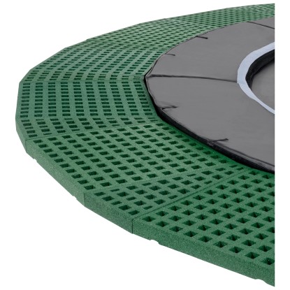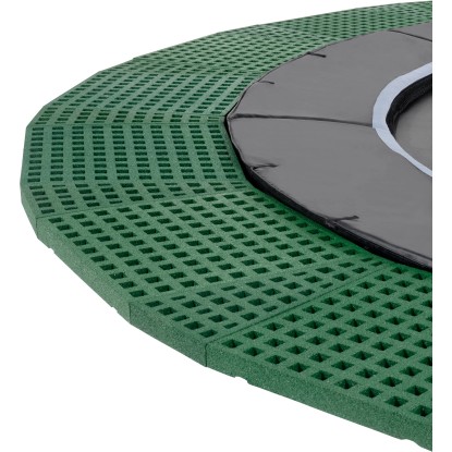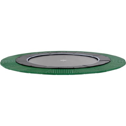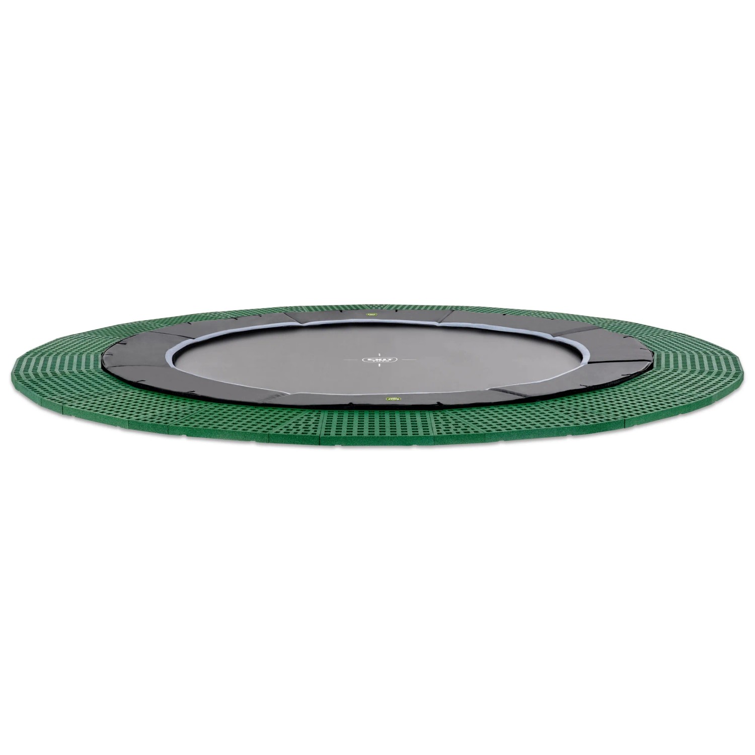Das Dynamic von Exit ist ein rundes, ebenerdiges Trampolin in mattem Schwarz, das ein Höchstmass an Sicherheit und Qualität bietet. Es wird mit Freezone-Sicherheitsplatten in Grün geliefert, die optimalen Rundumschutz bieten.
