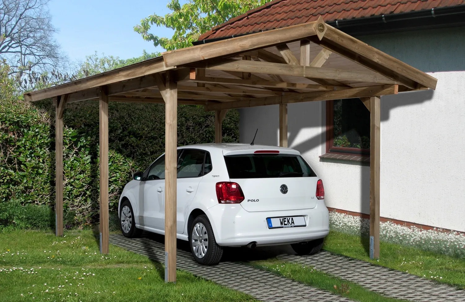 Der Weka Carport hat ein Massivholz-Satteldach, stabile Massivholzsparren und ist kesseldruckimprägniert.