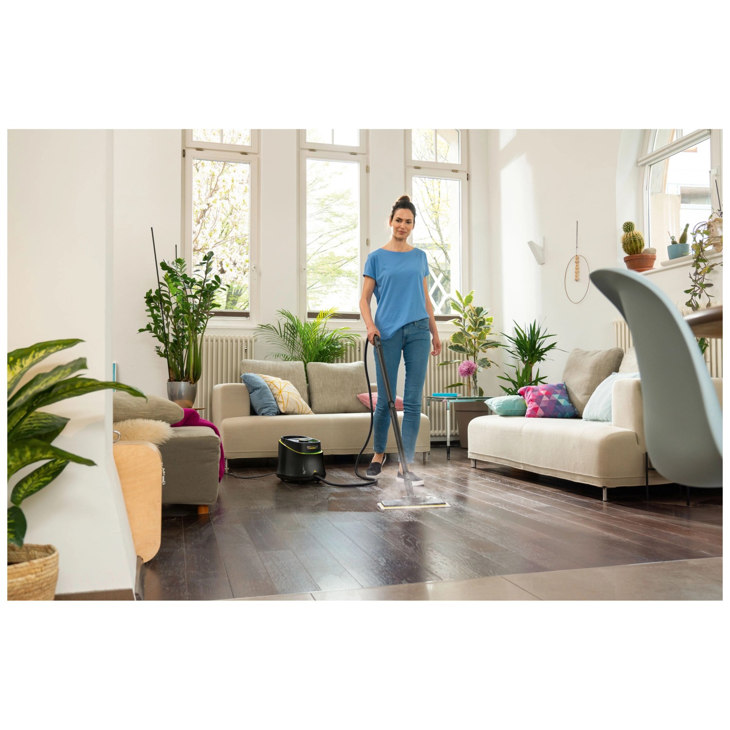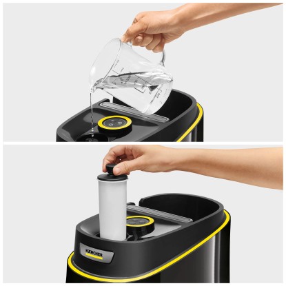 Der Kärcher Dampfreiniger SC 3 Deluxe Anniversary Edition ist eine limitierte Sonderedition mit besonderer Farb- und Zubehörausstattung anlässlich des 90-jährigen Firmenjubiläums. Er ist nach nur 30 Sekunden einsatzbereit und beseitigt bis zu 99,999 % aller Viren und haushaltsüblichen Bakterien auf Hartflächen. Die Bodendüse EasyFix mit flexiblem Gelenk sorgt für perfekte Reinigungsergebnisse. Eine flexible Handdüse ermöglicht die gründliche Reinigung von glatten Oberflächen. Die 2-stufige Dampfregulierung garantiert stets eine optimale Anpassung der Dampfmenge an die Oberfläche und den jeweiligen Verschmutzungsgrad. Das Zubehörfach am Gerät ermöglicht eine einfache und sichere Aufbewahrung von Zubehören, Kabel und Schlauch. Weitere Features sind die integrierte Entkalkungskartusche, der permanent wiederbefüllbare Wassertank für unterbrechungsfreies Reinigen und das LED-Leuchtband für die Anzeige der Betriebsmodi.
