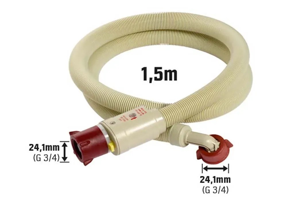 Der zuverlässige Zulaufschlauch wird an die Wasch- oder Spülmaschine angeschlossen. Er ermöglicht ein einfaches und schnelles Verlegen und erweitert so die Aufstellmöglichkeiten der Waschmaschine. Er ist 1.5 m lang und in der Farbe Gelb ausgeführt. Der Schlauch ist aus PVC gefertigt und besonders flexibel. Mit einer Überwurfmutter von 24,1 mm (G 3/4) erfolgt bequem und sicher der Anschluss. Ausgestattet ist der Schlauch mit einer modernen Schlauchplatzsicherung. Sie stoppt den Durchfluss und verhindert Schäden beim Platzen oder Verrutschen des Schlauches. Der Zulaufschlauch ist für maximal 90 °C Betriebstemperatur und maximal 10 bar Betriebsdruck ausgelegt.