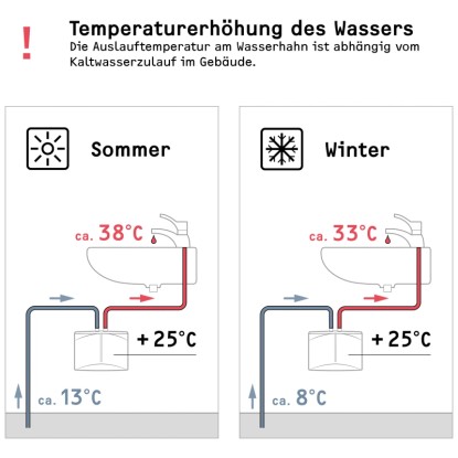 <br>Das kleine Gerät passt perfekt zu jeder Waschbeckenanwendung. Sobald Wasser durch das Gerät strömt, schaltet sich der Durchlauferhitzer automatisch ein und erwärmt das Wasser um 25 °C. Die Temperatur des auslaufenden Wassers hängt von der Zulauftemperatur und der Durchflussmenge ab: im Sommer ist die Auslauftemperatur meist höher, da das einlaufende Wasser wärmer ist, während sie im Winter niedriger ausfallen kann.