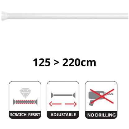 Die ausziehbare Stange ist perfekt geeignet für Duschvorhänge der Marke Spirella. Die Montage ist ganz einfach, denn es ist kein Bohren und kein Werkzeug erforderlich. Sie lässt sich schnell zwischen zwei Wänden einspannen und beliebig oft versetzen. Die Stange besteht aus Edelstahl, wodurch sie langlebig, korrosionsbeständig, rostfrei und solide ist. Sie passt sich schnell an Ihre Dusch- oder Wannenbefestigung an und wird einfach zwischen zwei Wände geklemmt. Sie kann dabei frei auf die gewünschte Länge angepasst werden. Der Durchmesser des Rohrs wird an jeden Vorhang angepasst und garantiert die Steifigkeit der Befestigung. Die Stange hat einen Durchmesser von 21 mm und eine Länge von 125 - 220 cm.