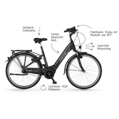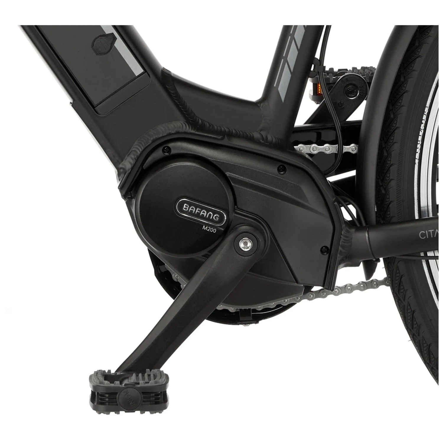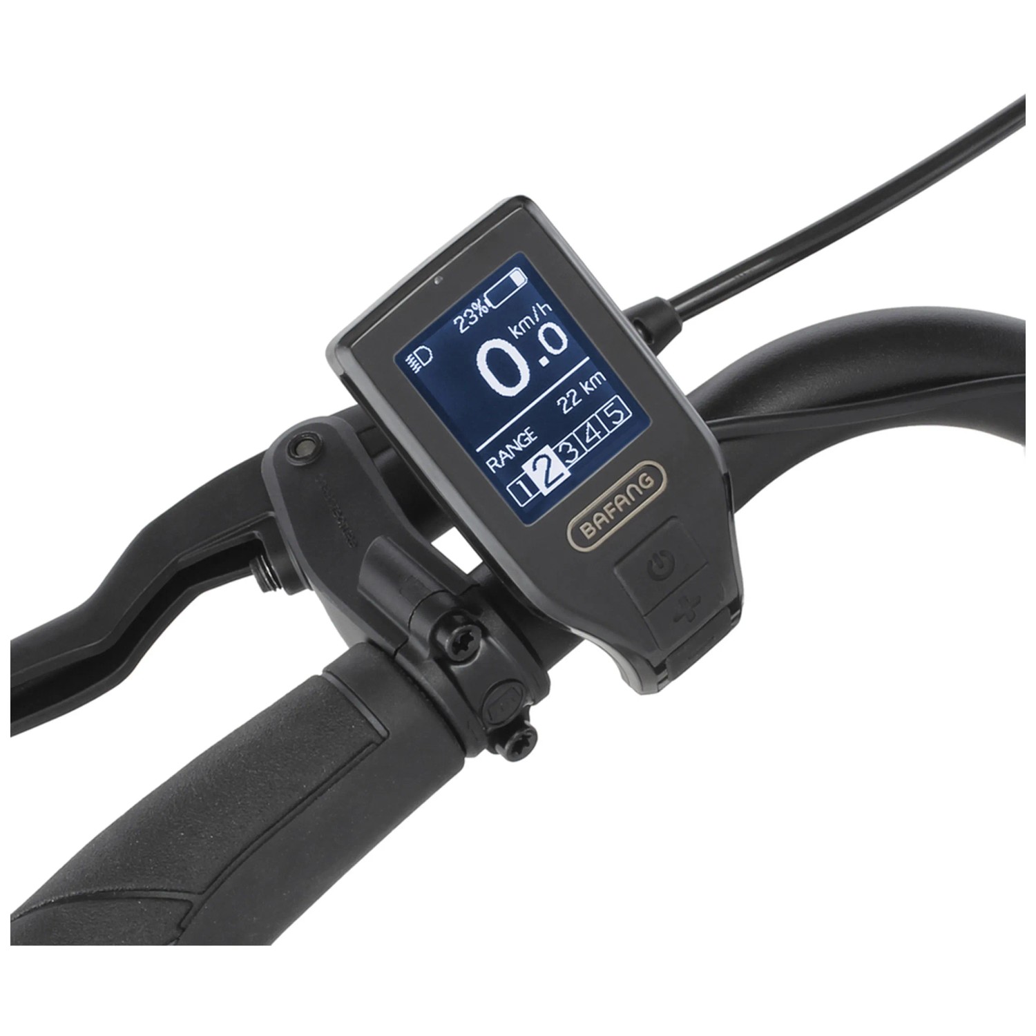 Der unsichtbar im Rahmen versteckte, kraftvolle Lithium-Ionen-Akku (36 V / 504 Wh) bietet eine Reichweite von bis zu 120 km. Der dynamische Bafang M200 Mittelmotor mit 65-Nm-Drehmoment, gesteuert durch ein modernes Bafang LCD 1400 CAN Bus Display mit USB-Anschluss, ermöglicht eine individuelle Anpassung der Antriebsunterstützung.