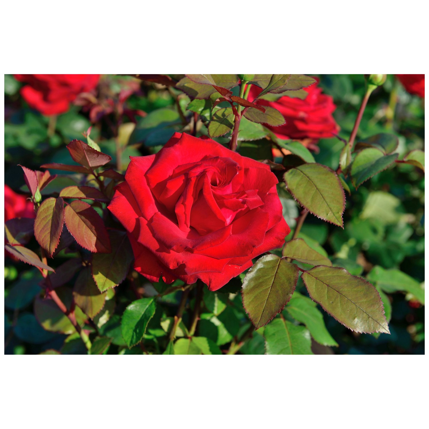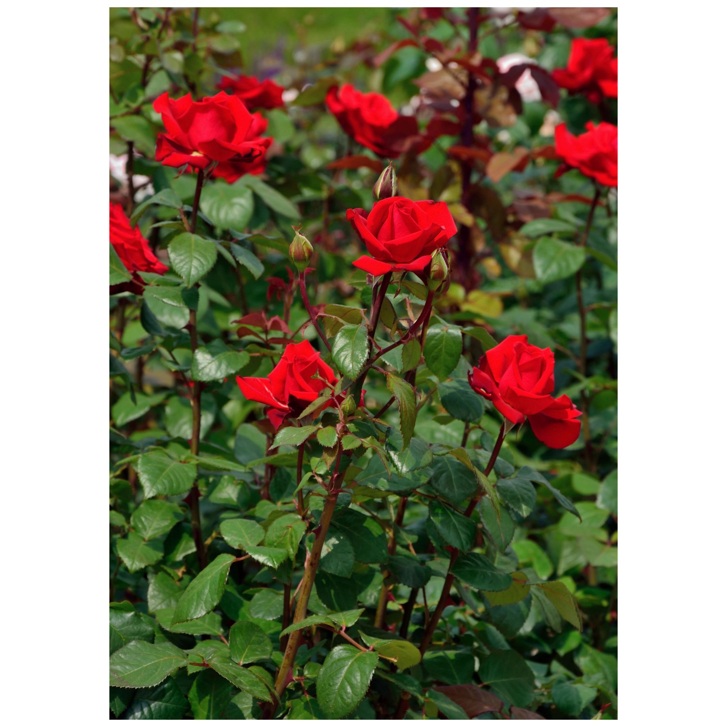 Die Edelrose Grande Amore (Rosa E Hybrida) trägt ihren Namen mit Stolz und überzeugt durch strahlend rote Blüten, die sowohl elegant als auch dezent duftend sind. Diese robuste und pflegeleichte Rose blüht reichlich und gedeiht am besten an sonnigen Standorten, wodurch sie ihren buschigen, verzweigten Wuchs optimal entfalten kann. Ob im Beet oder im Topf, die Grande Amore kommt sowohl einzeln als auch in Gruppen wunderbar zur Geltung und eignet sich hervorragend als hitzeverträgliche Schnittblume. In ihrer Blütezeit begeistert sie mit prächtigen, gefüllten Blüten in leuchtendem Rot, während die sommergrünen, dunkelgrünen Blätter einen schönen Kontrast zu den auffälligen Blüten bieten. Die aktuelle Pflanzhöhe bei Versand inkl. Topf beträgt 15 - 40 cm. Die maximale Wuchshöhe beträgt 80 cm.
