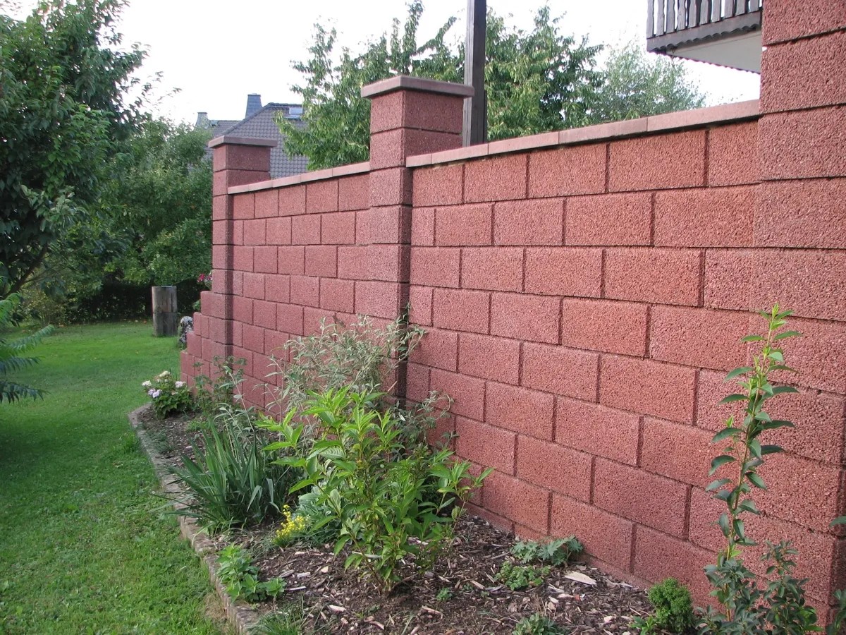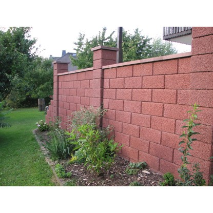 Die klassische Gartenmauer aus Beton mit strukturierter Oberfläche und umlaufenden Scheinfugen eignet sich sowohl für die Grundstückseinfassung als auch zur Hangbefestigung. Die seitlichen Nut-und-Federverbindungen an den einzelnen Hohlelementen bewirken eine stabile Verzahnung. Nach der Verfüllung der einzelnen Steinreihen (z. B. mit einem Sand-Kies-Gemisch) kann die oberste Reihe wahlweise mit Mutterboden befüllt und bepflanzt oder mit der passenden Abdeckplatte verschlossen werden.