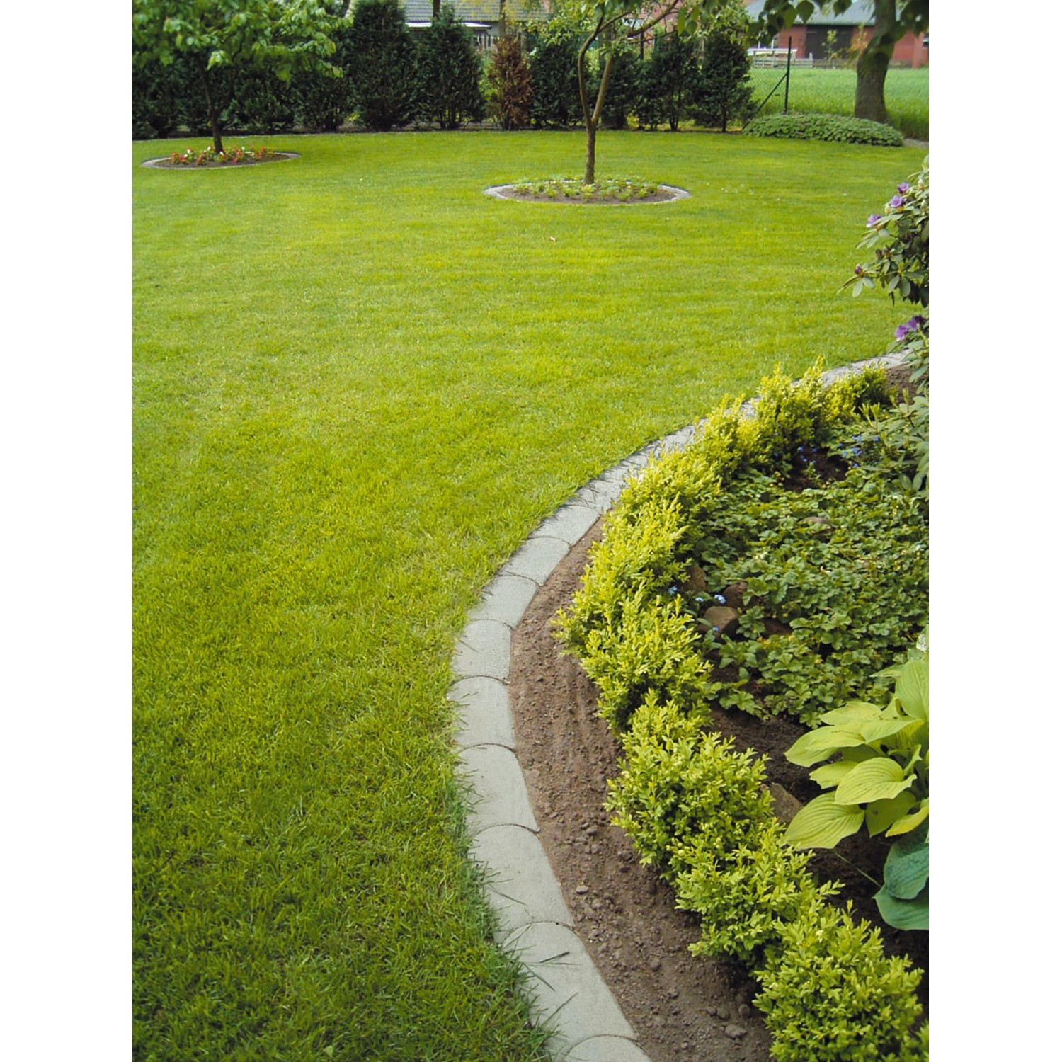 Die wirtschaftliche und saubere Art der geraden oder kurvenförmigen Rasen- oder Beetabgrenzung. Der flache Begrenzungsstein lässt sich leicht mit dem Mäher überfahren und erspart den aufwendigen Kantenschnitt.