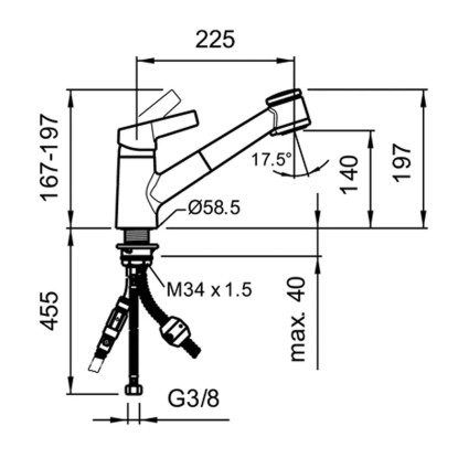 Spültischmischer, Ausladung: 225 mm, Schwenkauslauf mit Auszugsbrause