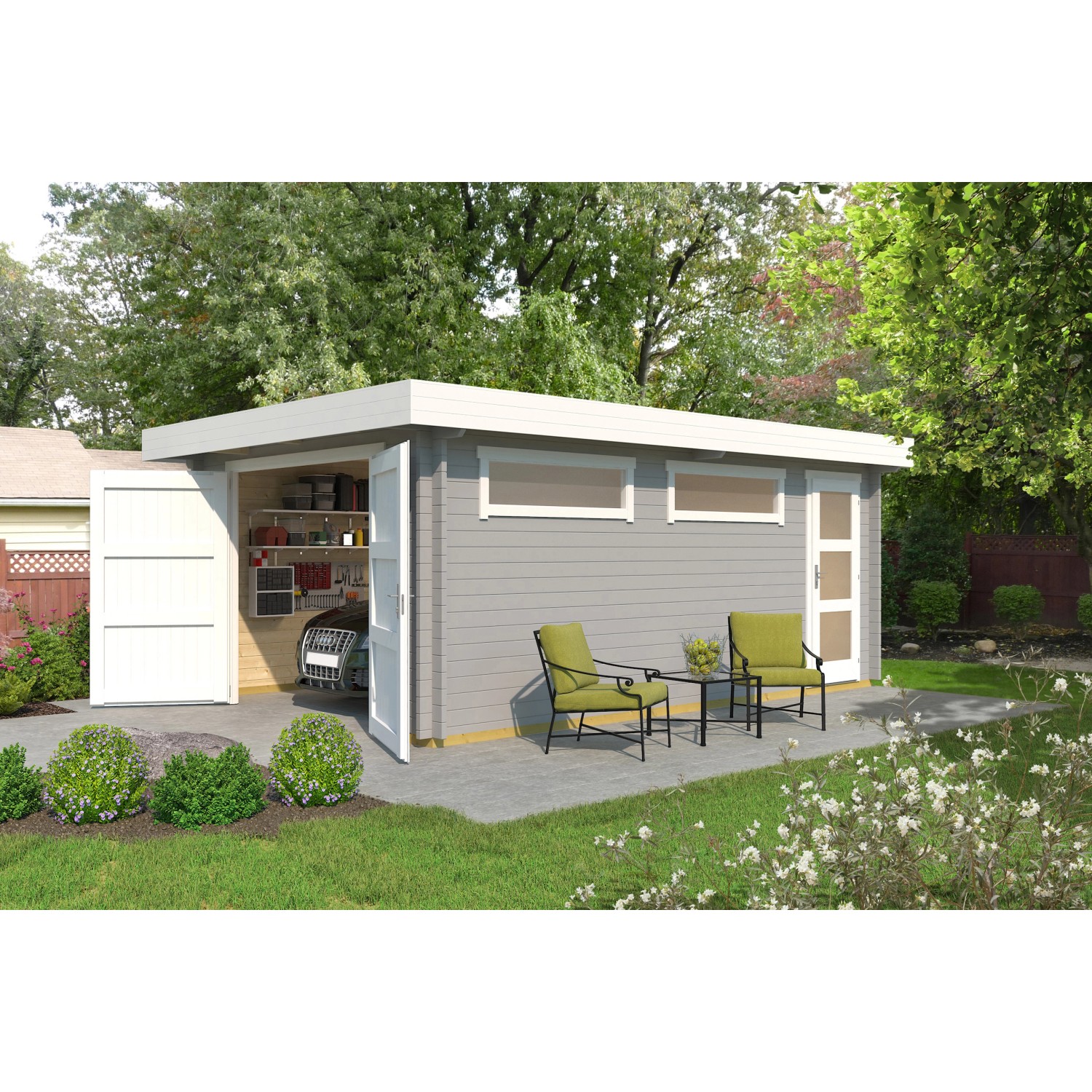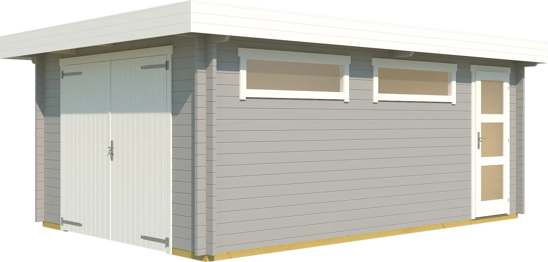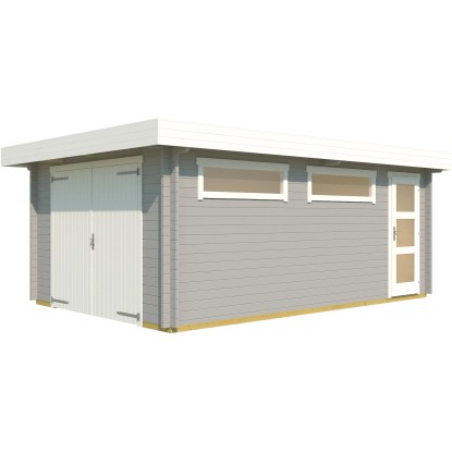 Die 44 mm starke Einzelgarage 441 aus massivem Fichtenholz bietet Platz für ein Auto. Sie ist mit einer Vollholz-Doppeltür und einer separaten Vollholz-Einzeltür und zwei schmalen feststehenden Fensterelementen ausgestattet.