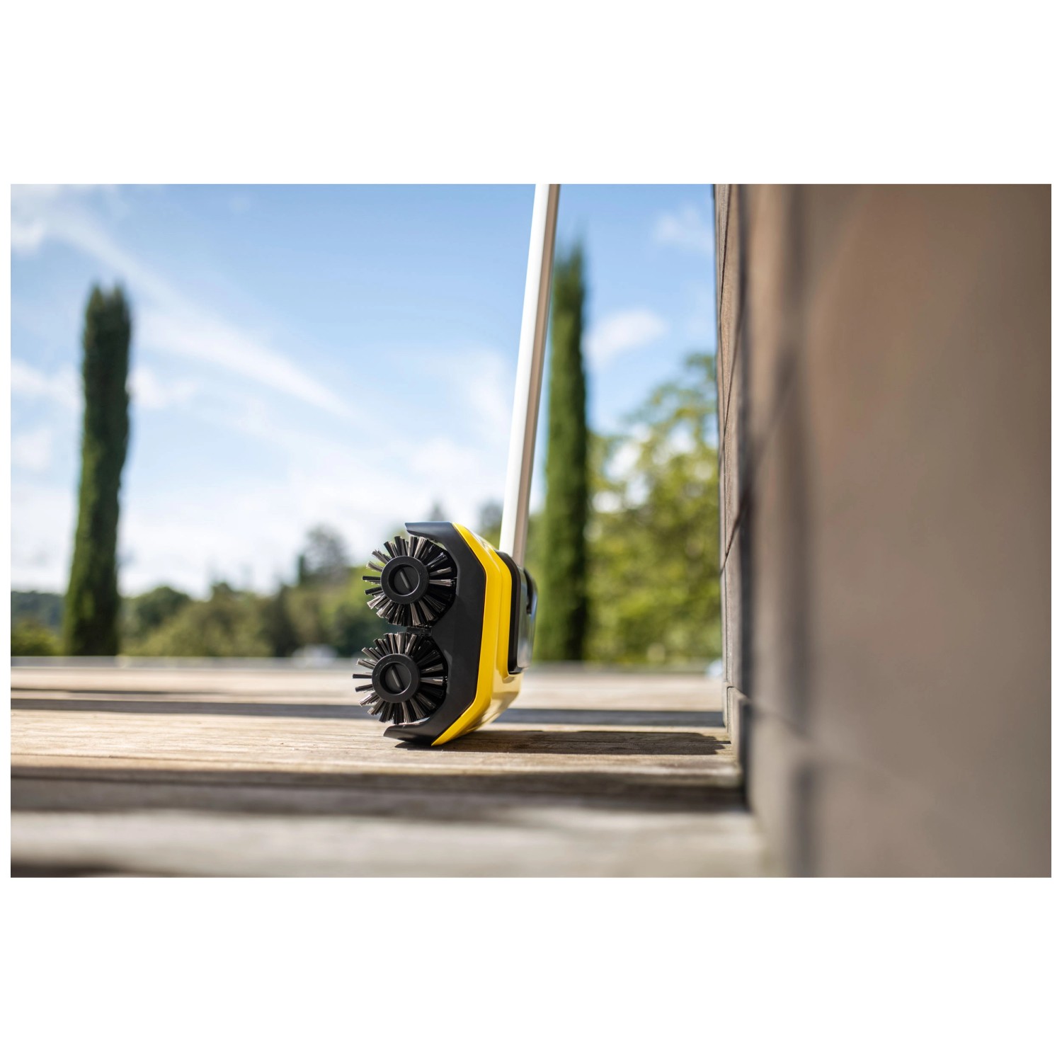 Mit dem elektrisch betriebenen PCL 6 werden Holzterrassen besonders komfortabel, gleichmässig, schnell und gründlich von hartnäckigen Verschmutzungen befreit. Einfach das Gerät an den Gartenschlauch anschliessen - schon kann mit der Reinigung begonnen werden. Dank der Kombination aus 4 rotierenden Bürstenwalzen und der regulierbaren Wasserzufuhr kann der Schmutz schnell und zuverlässig angefeuchtet sowie gleichzeitig abtransportiert werden. Die Terrasse wird im Handumdrehen gründlich sauber. Dabei wird nur so viel Wasser wie nötig verbraucht. Die Breite und Position der Walzen sind so ausgelegt, dass 2 Dielen in einem Schritt und bis an die Kante gereinigt werden können, was zusätzlich Zeit spart. Dank der austauschbaren Bürstenwalzen können neben Holz- und WPC-Belägen auch glatte und feinporige Steinfliesen und -platten mit Komfort und perfekten Ergebnissen gereinigt werden.